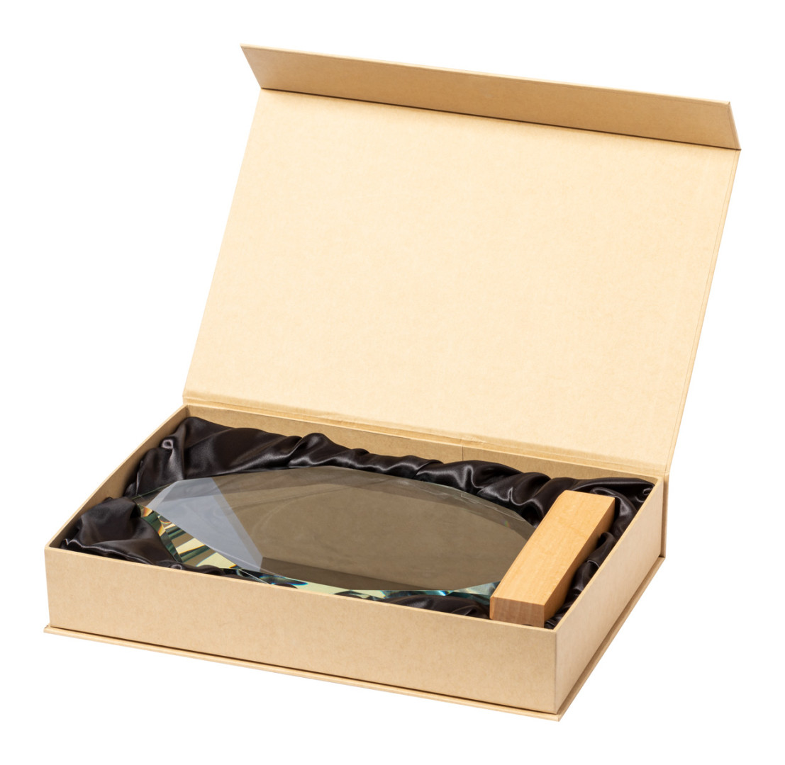 Sklenená trofej s dreveným podstavcom. V darčekovej krabičke z kraftového papiera.