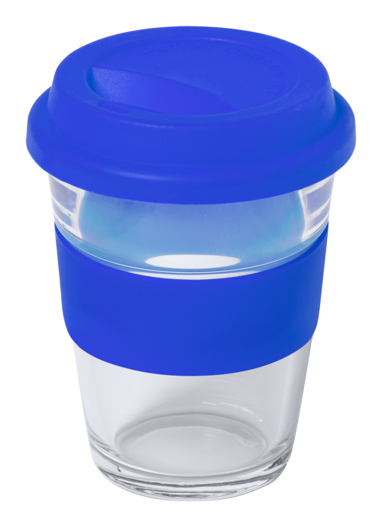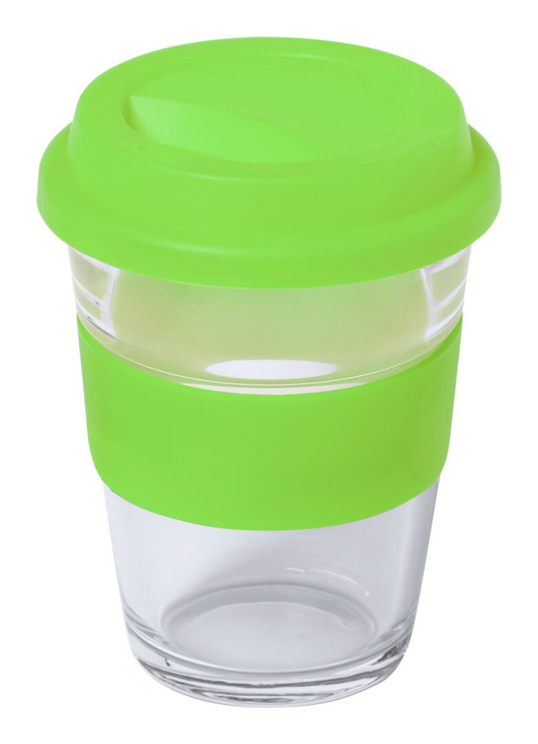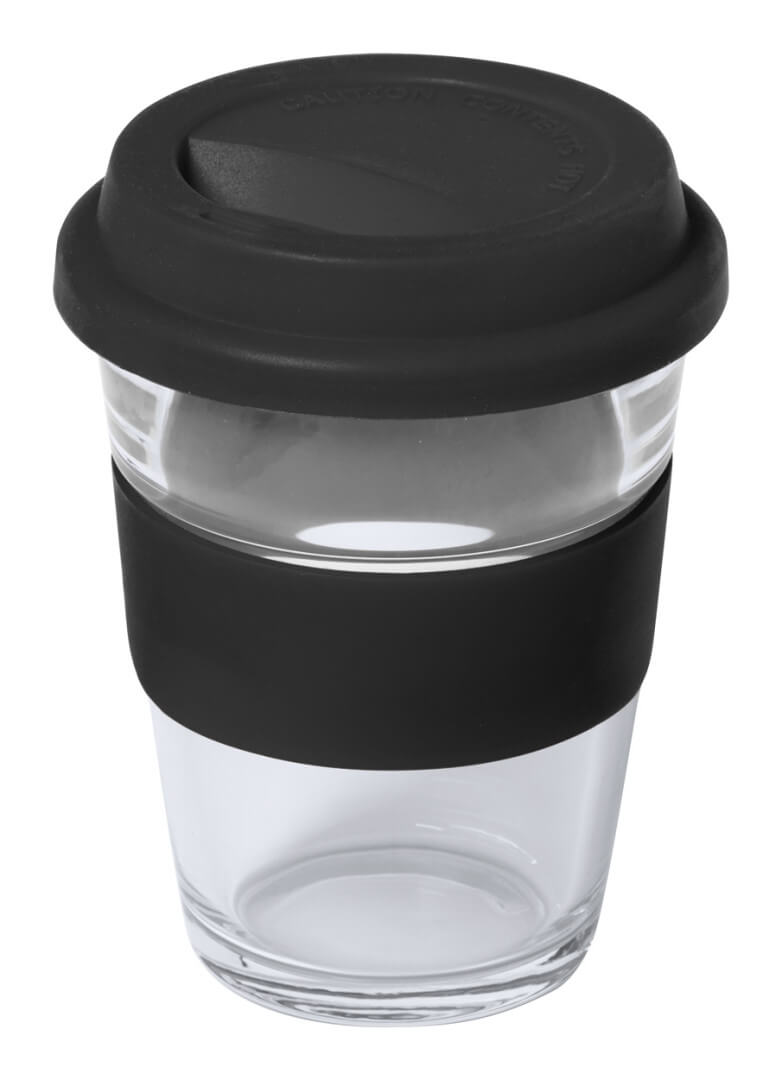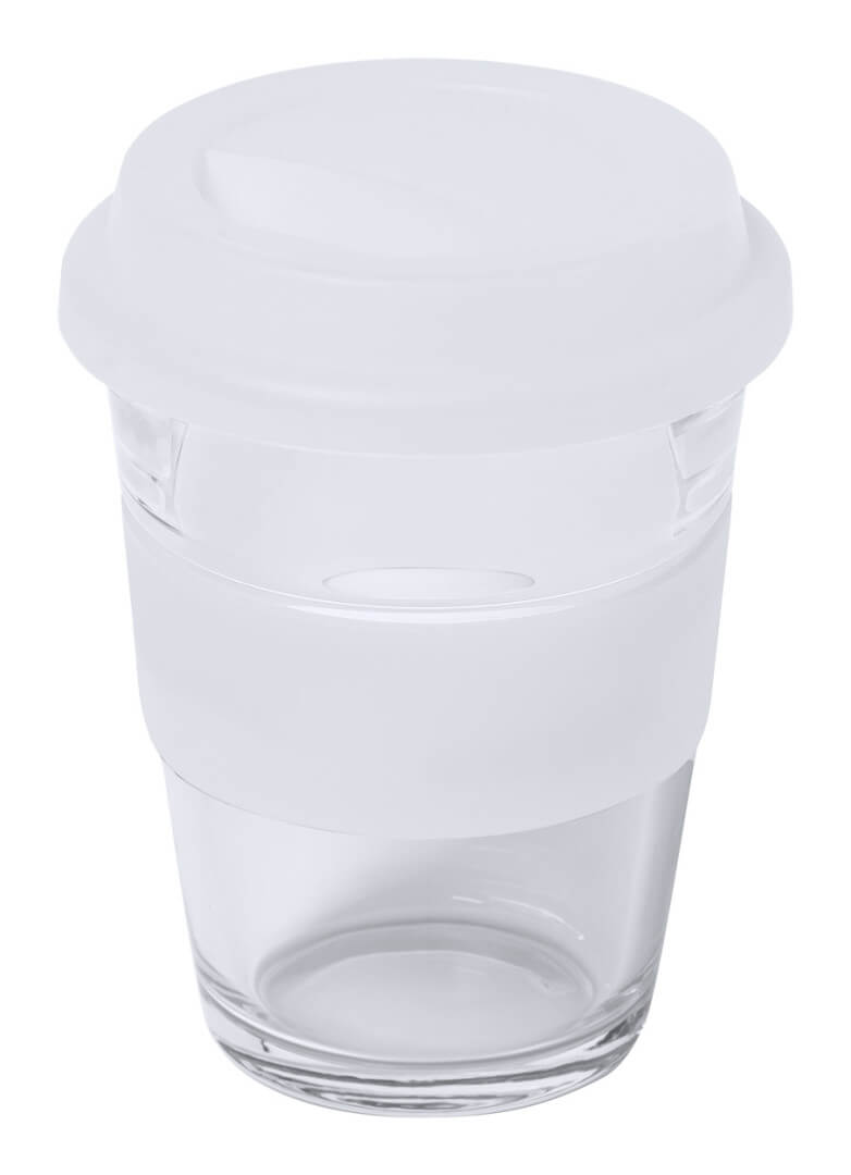 Sklenený jednostenný cestovný hrnček so silikónovým viečkom a pásikom na pitie, 350 ml.