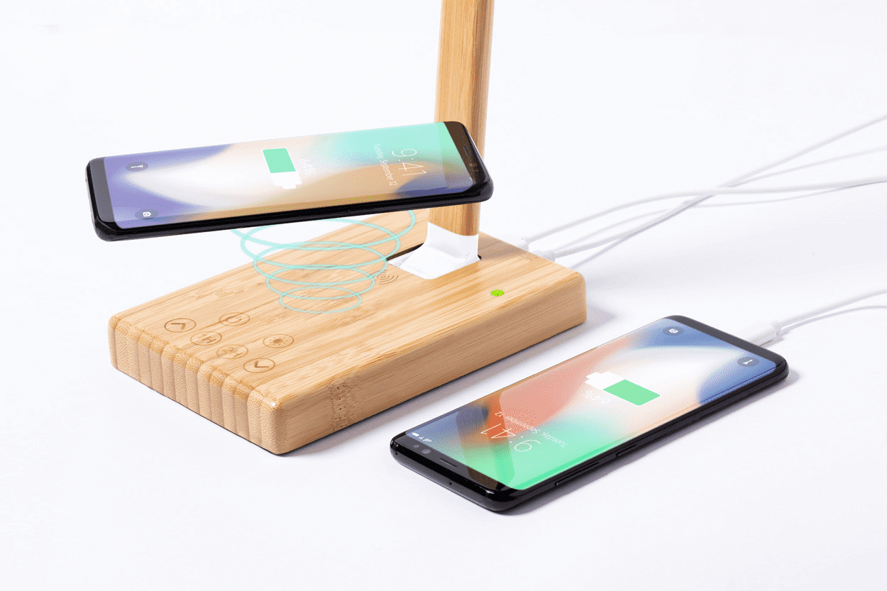 Bambusová multifunkčná stolná lampa s 25 LED, nastaviteľným jasom a 1/2 hodinovým časovačom. So vstavanou bezdrôtovou rýchlonabíjačkou (10W) a portom USB na nabíjanie 2 zariadení súčasne (1 bezdrôtovo a 1 cez kábel). Vrátane USB nabíjacieho kábla.