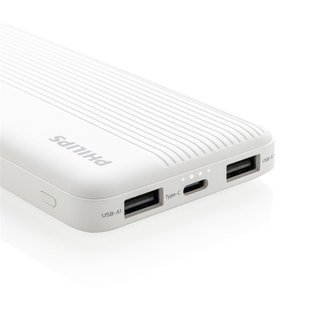 Tenká powerbanka s kapacitou 10 000 mAh a 2 USB výstupy. Vybavená LED indikátormi nabitia, pokročilými bezpečnostnými prvkami a Li-Poly batériou s dlhou životnosťou. Vstup: Micro USB: 5 V/2 A, USB C: 5 V/2 A. Výstup: USB A: 5 V/2,1 A, USB A2: 5 V/1 A. Balené v darčekovej krabičke Philips. 1 batérií typu Li-poly súčasťou balenia.