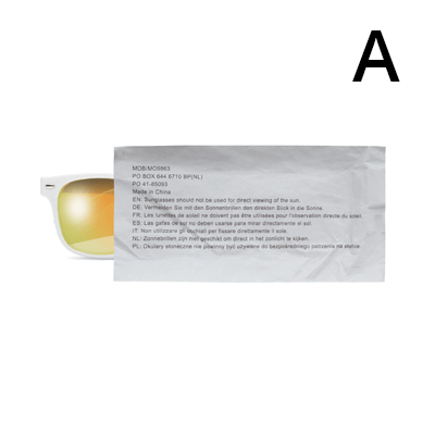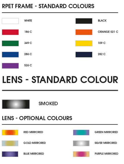 Vytvorte si svoj obľúbený dizajn slnečných okuliarov s množstvom možností. Rám, šošovky aj bočnice podľa vašich predstáv. Okuliare sú potlačiteľné logom na jednotlivých častiach alebo si nechajte vonkajšiu stranu vytlačiť svojim dizajnom od okraja po okraj (plnofarebne). Slnečné okuliare sú jednotlivo balené v papierovom vrecúšku. Môžete si však zvoliť RPET vrecúško (9x17cm), ktoré je možné celé potlačiť. K okuliarom si môžete priplatiť antibakteriálnu úpravu.
