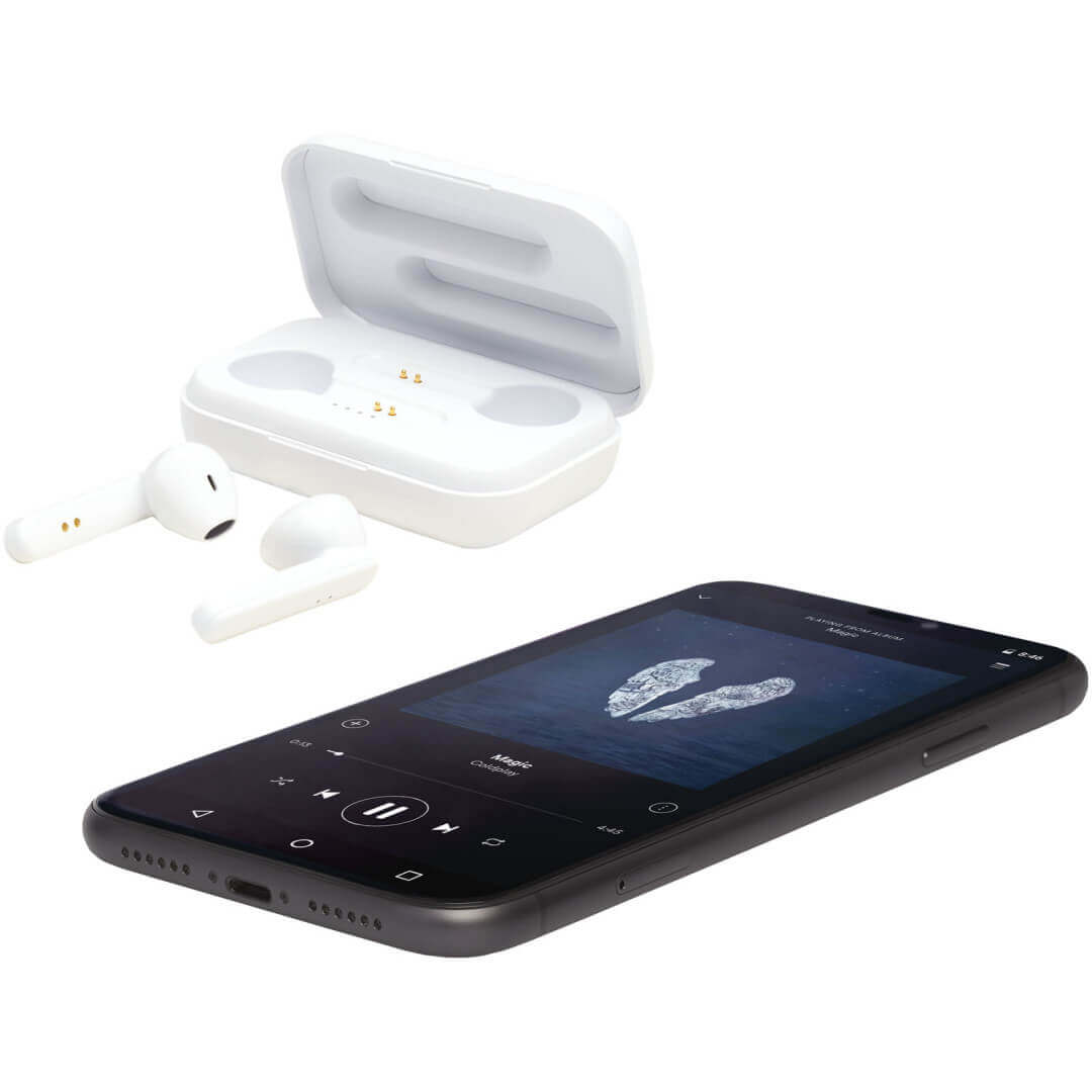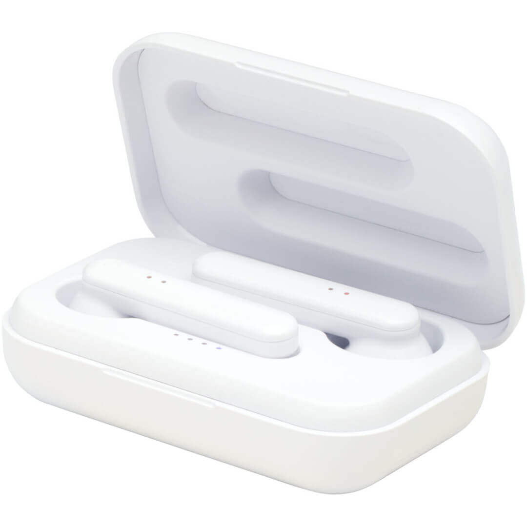 Slúchadlá s multifunkčným tlačidlom pre ovládanie všetkých funkcií: Zapnutie/vypnutie, prijatie hovoru / zavesenie, prehrávanie, pozastavenie, ďalšia/predchádzajúca skladba, zvýšenie/zníženie hlasitosti, aktivácia hlasového asistenta. Bluetooth® 5.0 s dosahom až 10 metrov. Doba prehrávania je až 2 hodiny pri maximálnej hlasitosti a slúchadlá je možné plne nabiť za 1,5 hodiny. Napájacie puzdro dokáže plne nabiť slúchadlá aspoň dvakrát na jedno nabitie. Balené v štandardnej darčekovej krabičke.