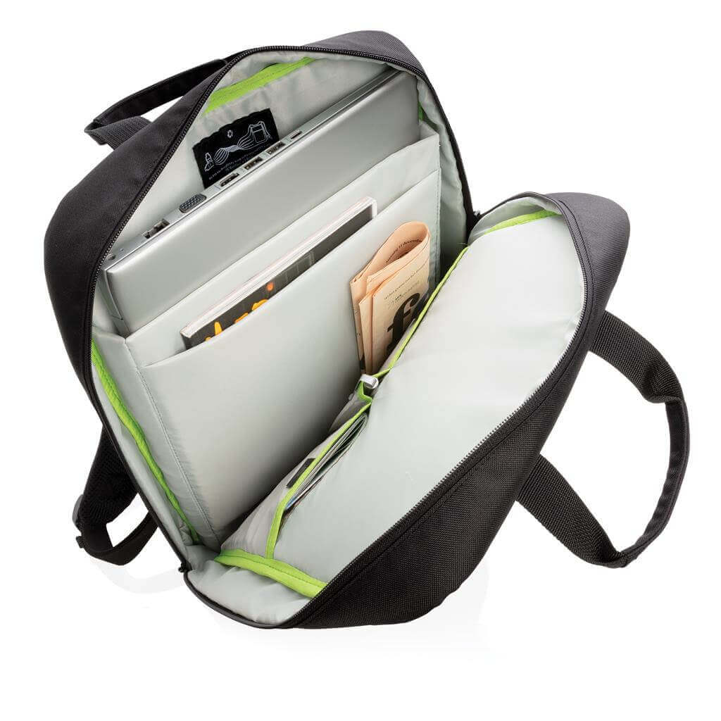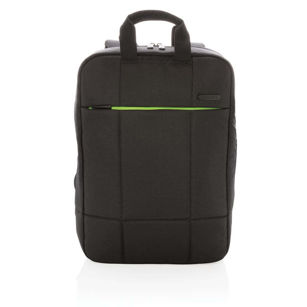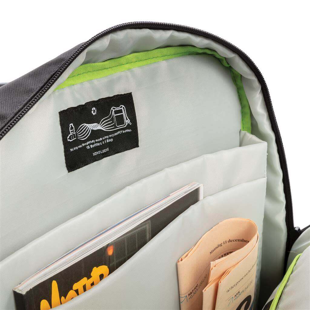 Moderný batoh s minimálnou uhlíkovou stopou vďaka využitiu recyklovaných PET ako hlavného materiálu pri výrobe. Priestor pre prenos až 15,6 "notebooku, predné vrecko na zips pre rýchly prístup. Vyrobený z Rpety bez použitia PVC. Zloženie: vonkajšia časť: 100% 600D recyklovaný polyester; vnútorná časť (podšívka): štandardné 210D polyester. Ochranný vzor® PMS color 1: Black, PMS color 2: 374
