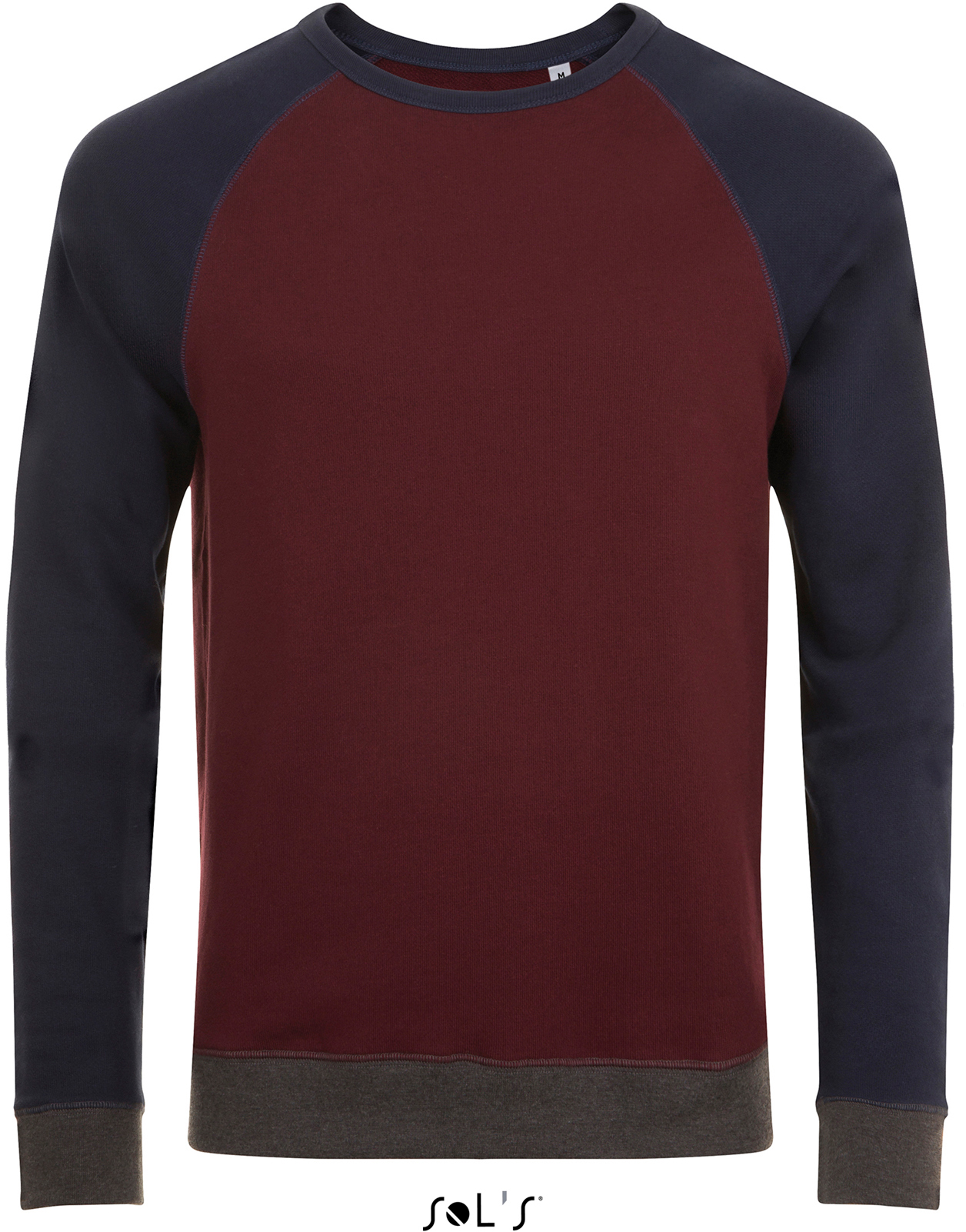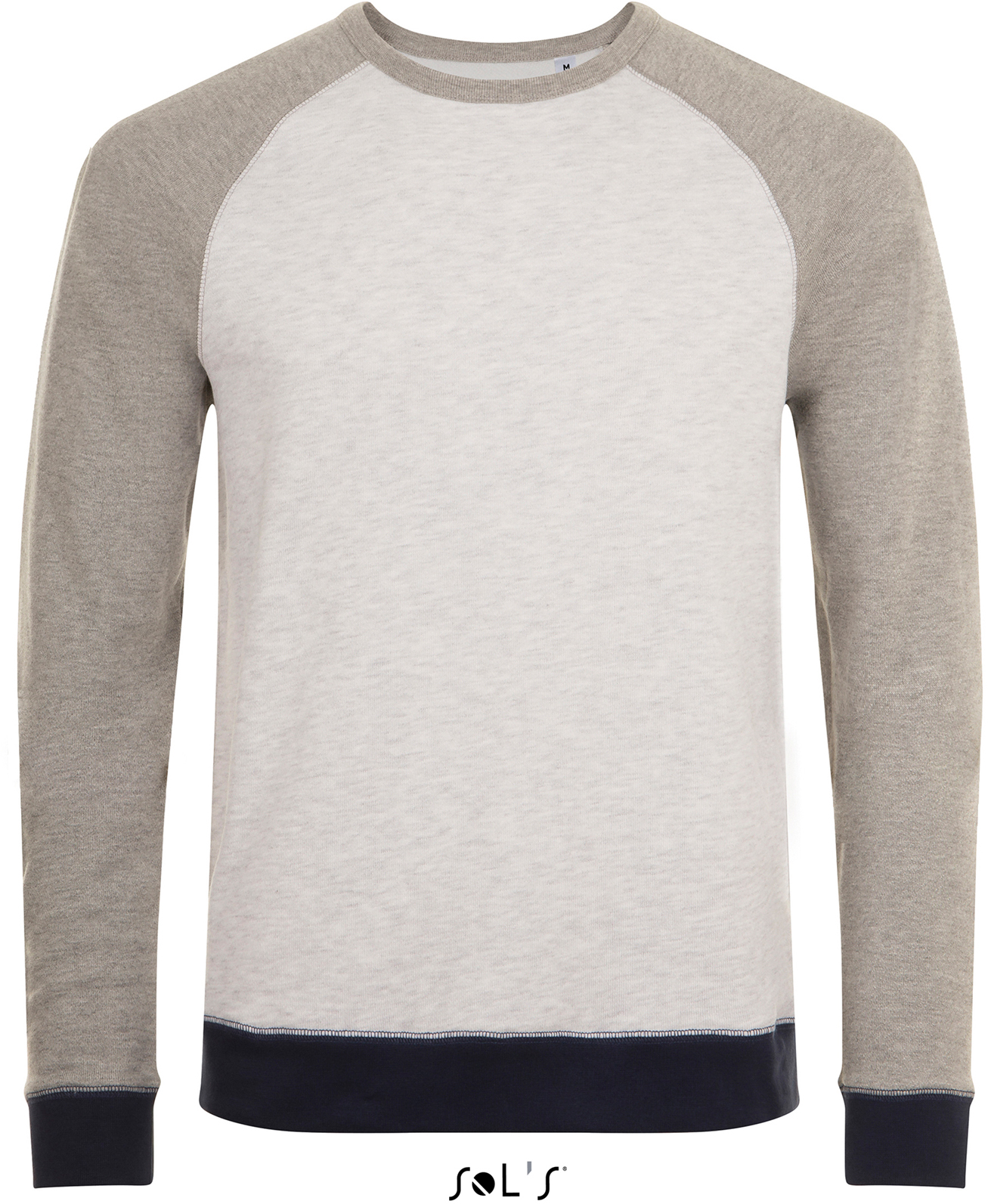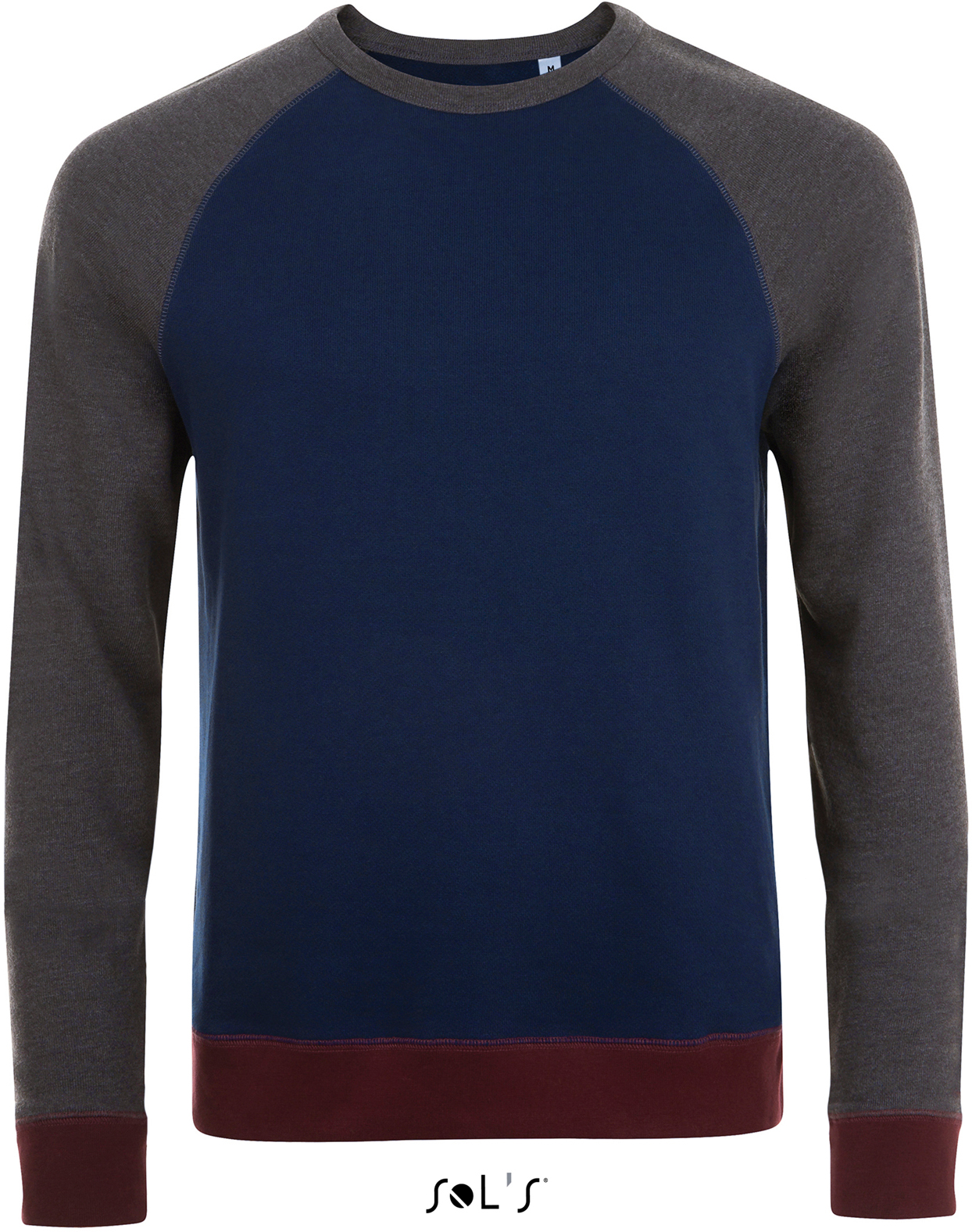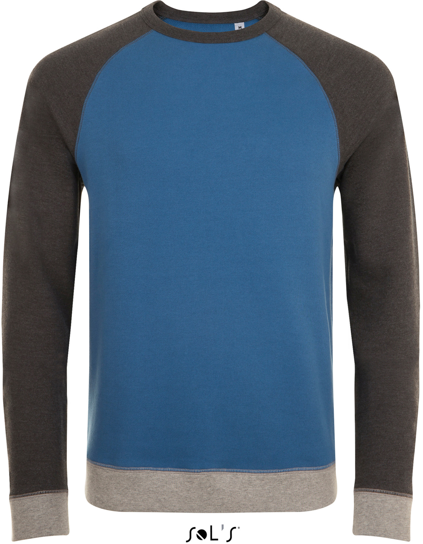 320g / m², 100% bavlny, baby french terry, ash / grey melange: 95% bavlny, 5% viskóza, french navy / charcoal melange: 90% bavlny, 10% polyester, slate blue / charcoal melange: 85% bavlny, 12 % polyester, 3% viskóza 2x2 rebrový úplet na golieri, patentoch rukávov a lemu, raglánový rukáv a patenty v kontrastnej farbe, neutrálne veľkostnej label