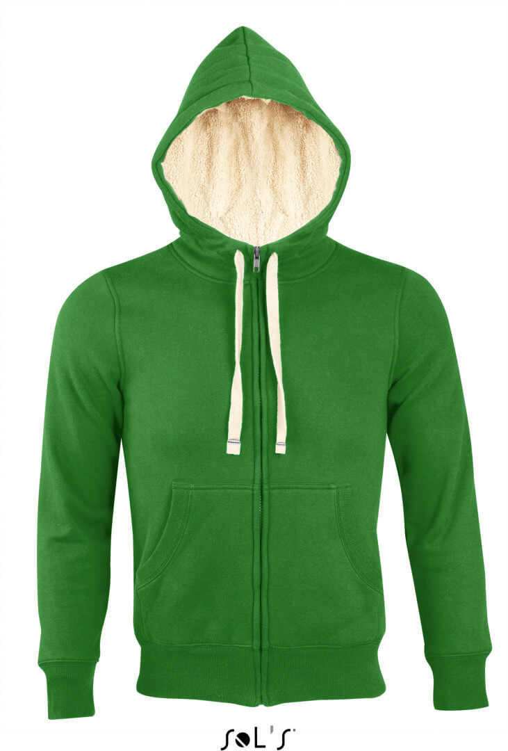 280g / m², 80% bavlna, 20% polyester vypasovaný strih, skrytý zips, klokanie vrecko, kontrastné vnútro kapucne s širokými sťahovacími šnúrkami, na spodnom leme a rukávoch elastické rebrované manžety