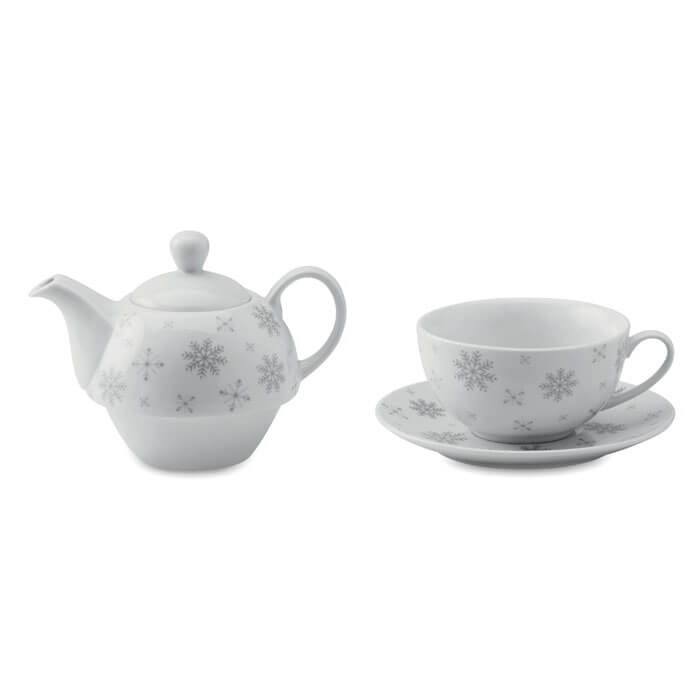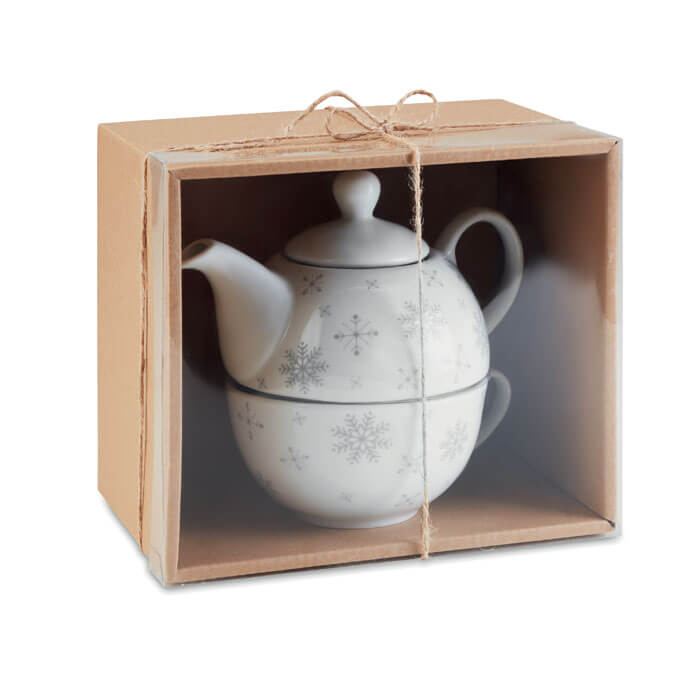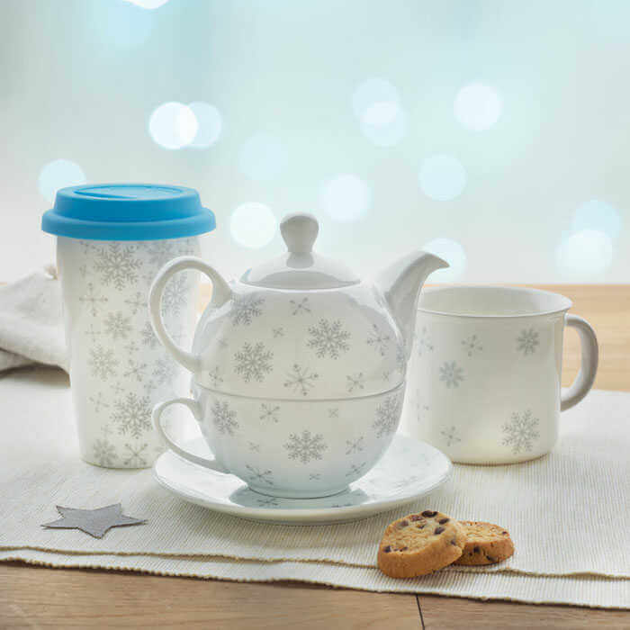 Čajový set obsahujúci kanvičku 400 ml so snehovými vločkami a keramickým hrnčekom 260 ml. Dodávame v kartónovom darčekovom boxe. Tampónová potlač nie je vhodný do umývačky.