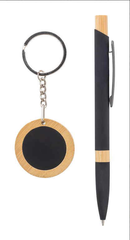 2dielna darčeková sada v darčekovej krabičke z kraftového papiera. Vrátane guľôčkového pera z recyklovaného hliníka s bambusovými detailmi, pogumovaným povrchom a modrou náplňou a bambusového krúžku na kľúče s pogumovaným povrchom z recyklovanej nerezovej ocele. Obe položky majú špeciálnu povrchovú úpravu na zrkadlové laserové gravírovanie.