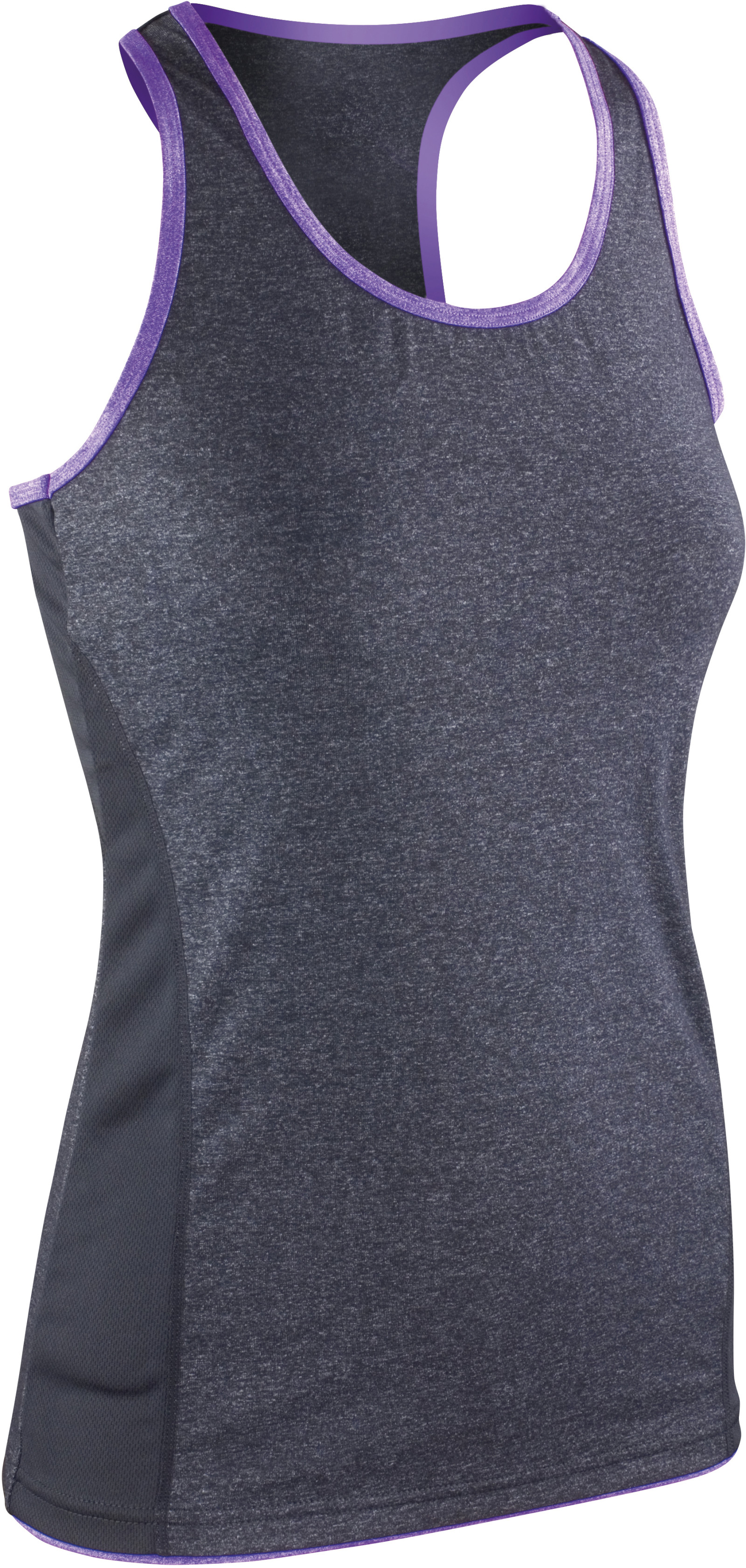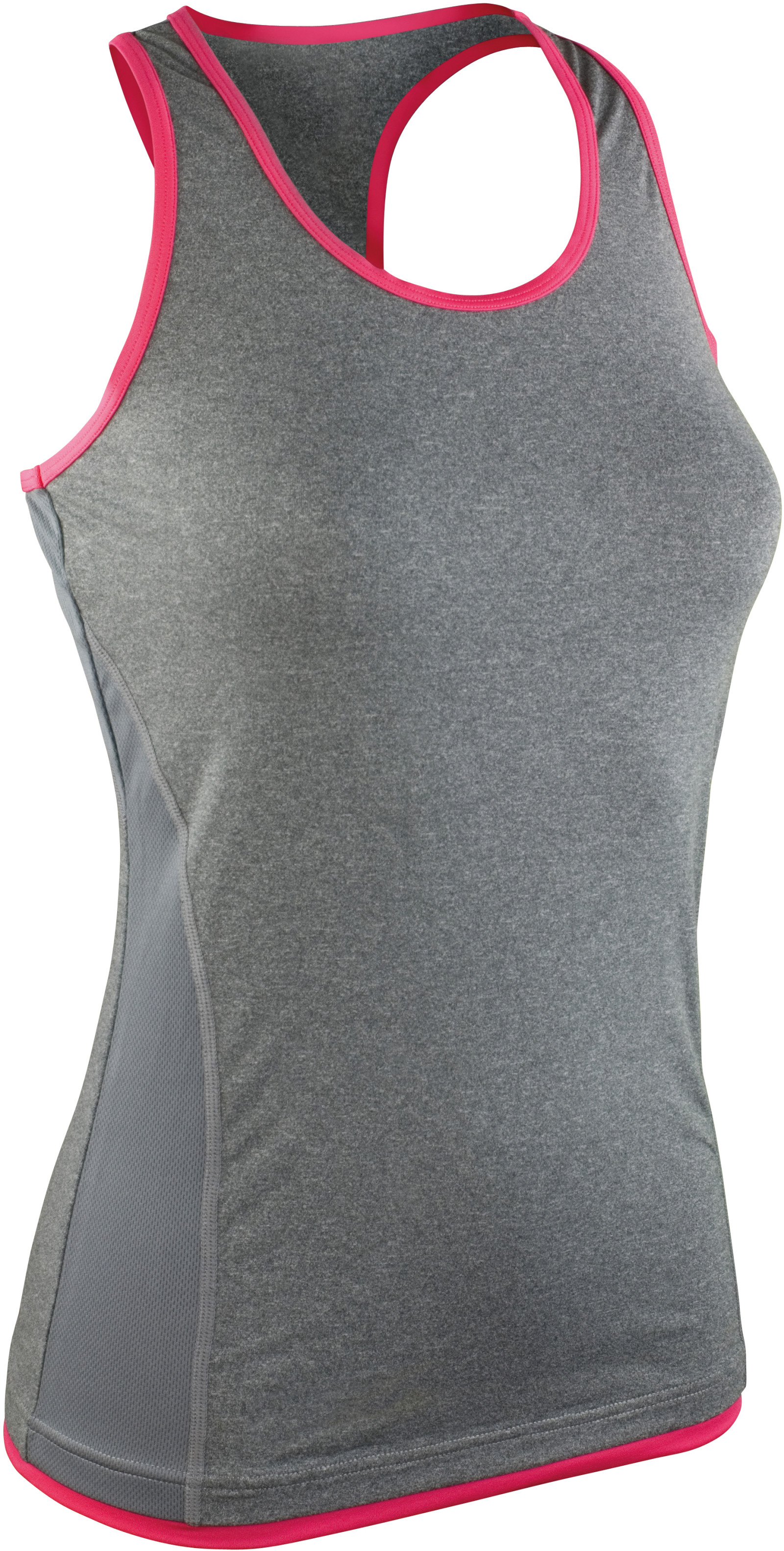 160g / m², grey marl / hot coral: 47% nylon, 47% polyester, 6% elastan, phantom grey / lavender: 90% polyester, 10% elastan, vsadka 100% polyester ľahko vypasovaný strih, ploché stehy, kontrastné lemy výstrihu a dolného okraja, vykrojený chrbát, na boku kontrastná vložka, rýchloschnúci priedušný materiál