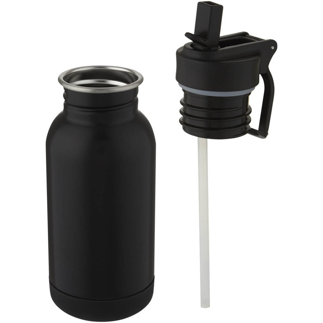 Jednostenná športová fľaša z nerezovej ocele 18/8 s protišmykovým silikónovým dnom. Obsahuje skrutkovacie slamené veko s pútkom na prenášanie, ideálne pre batohy. Široký otvor pre ľahké plnenie, nalievanie a čistenie. Bez BPA, testované a schválené podľa nemeckej legislatívy o bezpečnosti potravín (LFGB). Testované a schválené na obsah ftalátov podľa predpisov REACH. Objem je 400 ml. Neodporúča sa umývať v umývačke. Dodáva sa v darčekovej krabičke z recyklovanej lepenky.