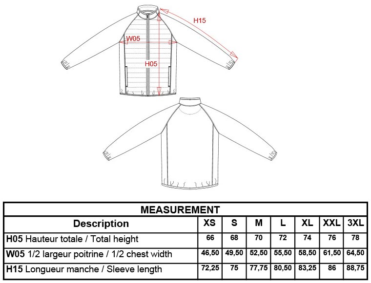 Vodoodpudivý materiál, elastické manžety na výstrihu, rukávoch a spodnom leme, zips v kontrastnej farbe s ochranou brady, 2 bočné vrecká so zipsom, príjemný komfort pri nosení, odolná, pružná tkanina, prateľné na 30 °, nemožno sušiť v sušičke, nemožno chemicky čistiť .