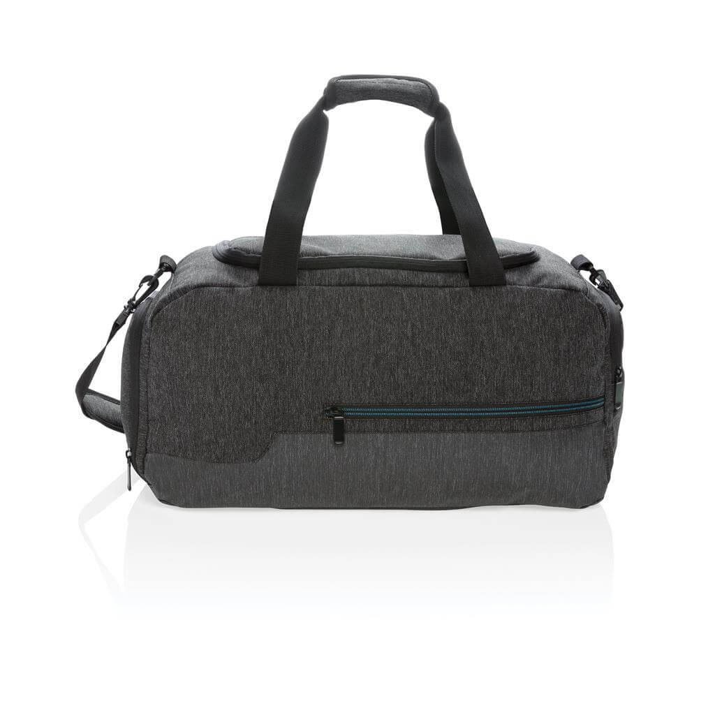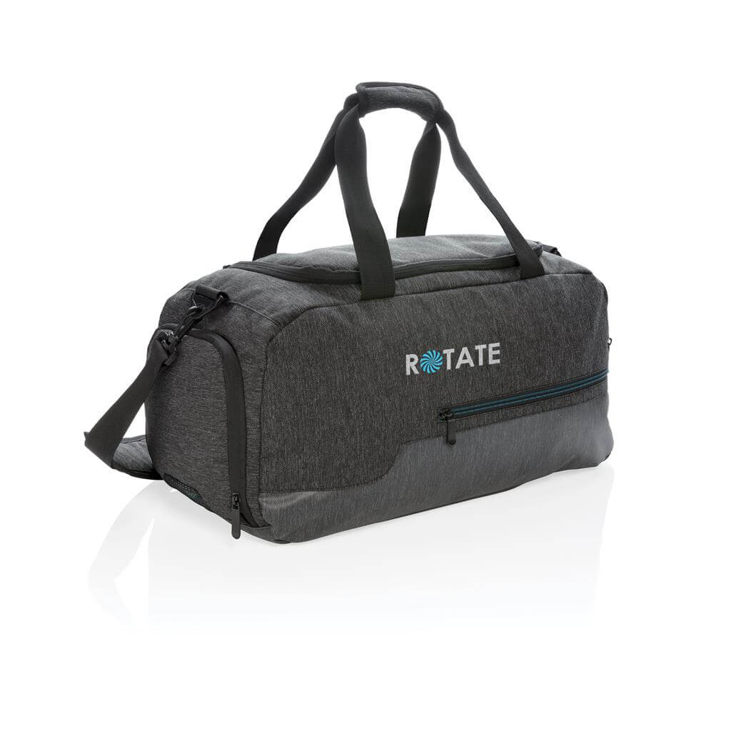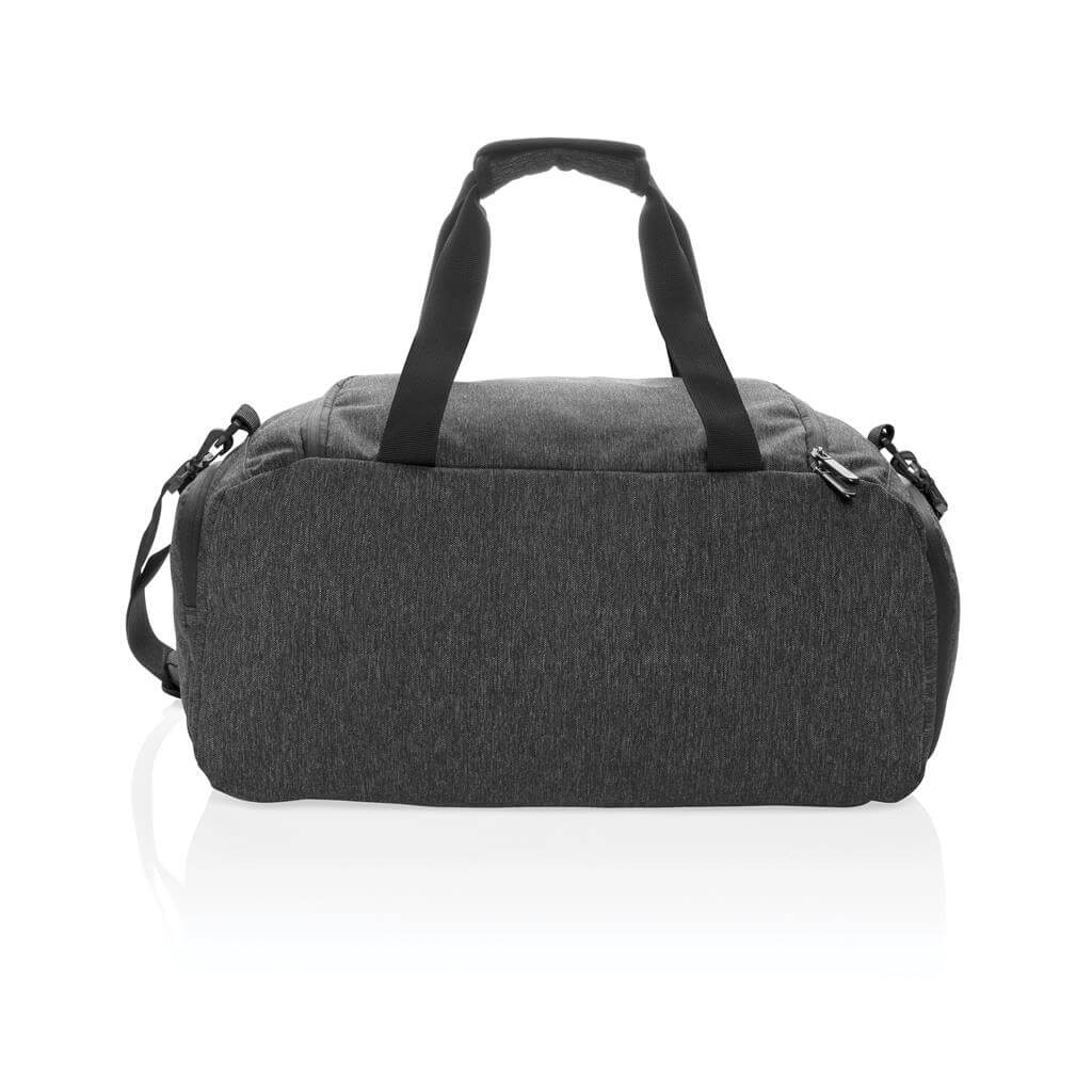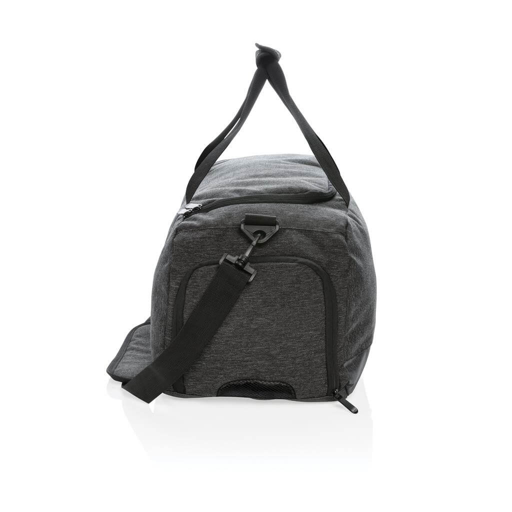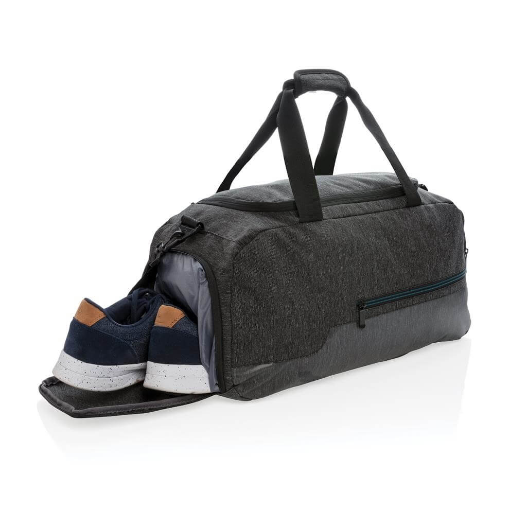 Ideálne navrhnutá taška pre aktívny životný štýl. Vyrobená z odolného materiálu 900D so zvrškom odolným vode brániaci premoknutiu z vlhkých podláh v posilňovniach alebo v prírode. Spevnená madla do ruky a mäkčený popruh na rameno ponúkajú všestranné nosenie. Priestranný hlavný oddiel s vnútorným vreckom pre uschovanie cenností, priedušný priečinok na obuv a predné vrecko na zips ideálne na často využívané predmety (kľúče, mobilný telefón a ďalšie). PVC free. PMS color 1: Black