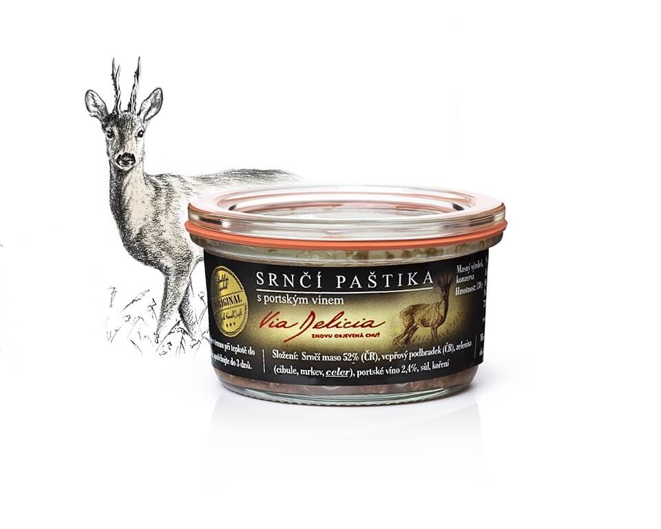 Srnčia paštéta s portským vínom Via Delicia je inšpirovaná starými receptúrami, kde sa kvalitné srnčie mäso kombinuje so sladkým vínom. Hrubo mletá paštéta z vyhľadávaného srnčieho a bravčového mäsa, cibuľou, mrkvou a zelerom. Portské víno dodáva paštéte nezameniteľnú chuť. Výborná na pečivo aj na studenú misu.