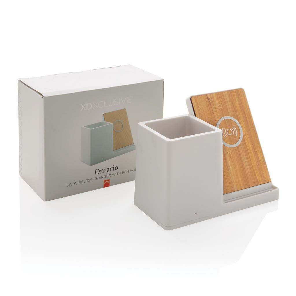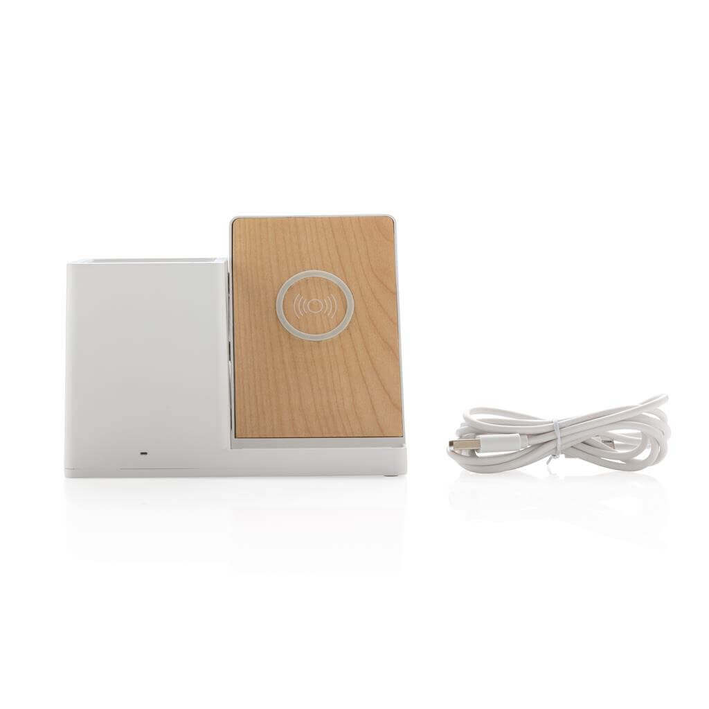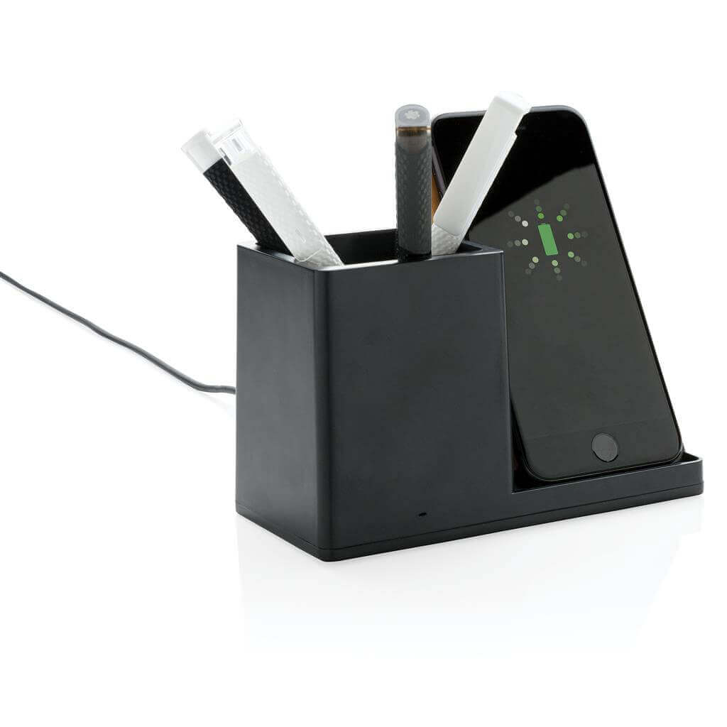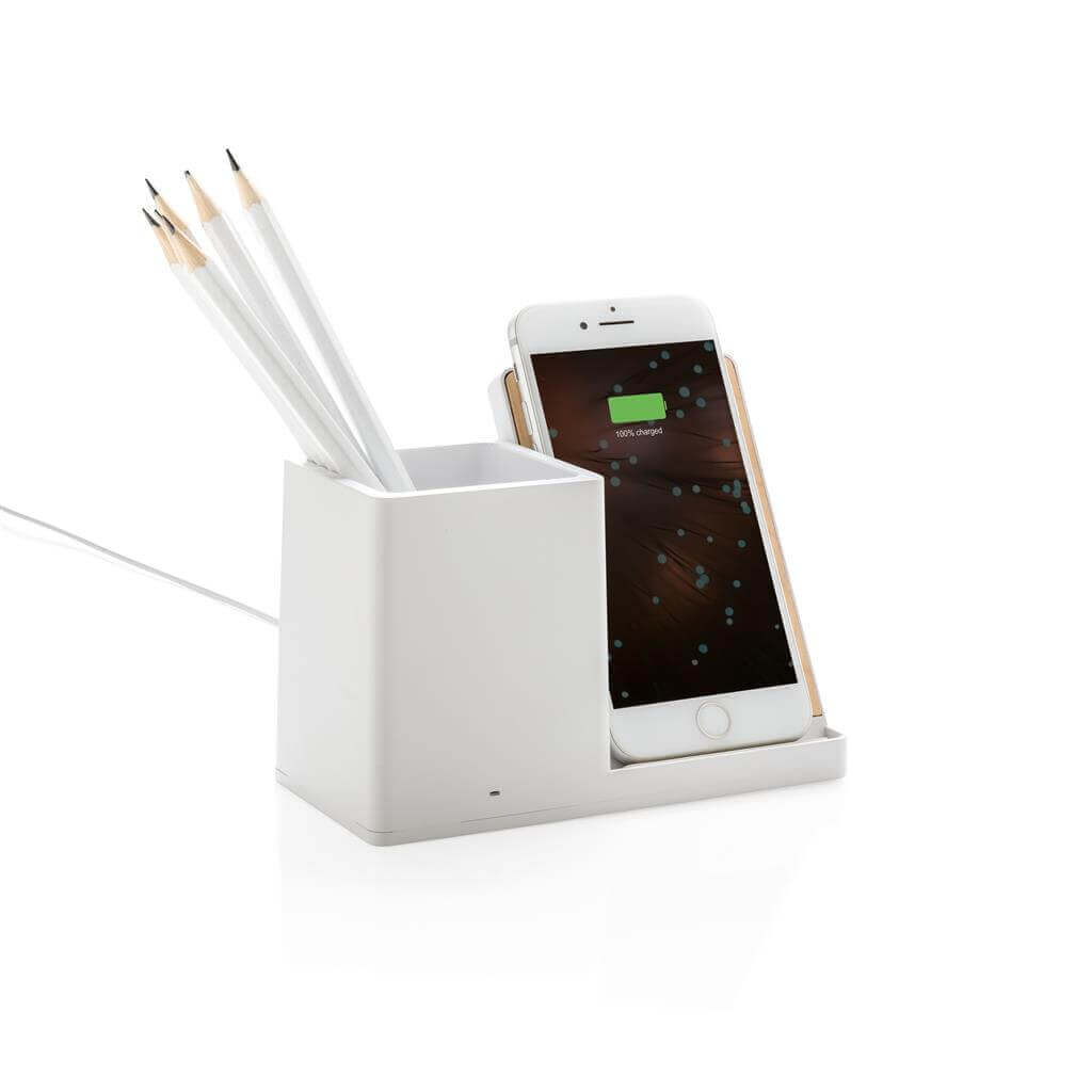 Štýlový stojanček na písacie potreby či iné drobnosti s bezdrôtovou nabíjačkou vyrobený z ABS a prírodného bambusu. Geniálny vychytávka, ktorá povýši praktickosť vášho pracovného stola na kompletne novú úroveň. Tie najčastejšie používané veci budete mať stále po ruke a na stole zaručene poriadok. Rýchlosť nabíjania 5W. Kompatibilné so všetkými zariadeniami podporujúcimi QI, ako sú najnovšie generácie Android, iPhone 8, 8S a X. Vrátane 1,5 m dlhého micro USB kábla.