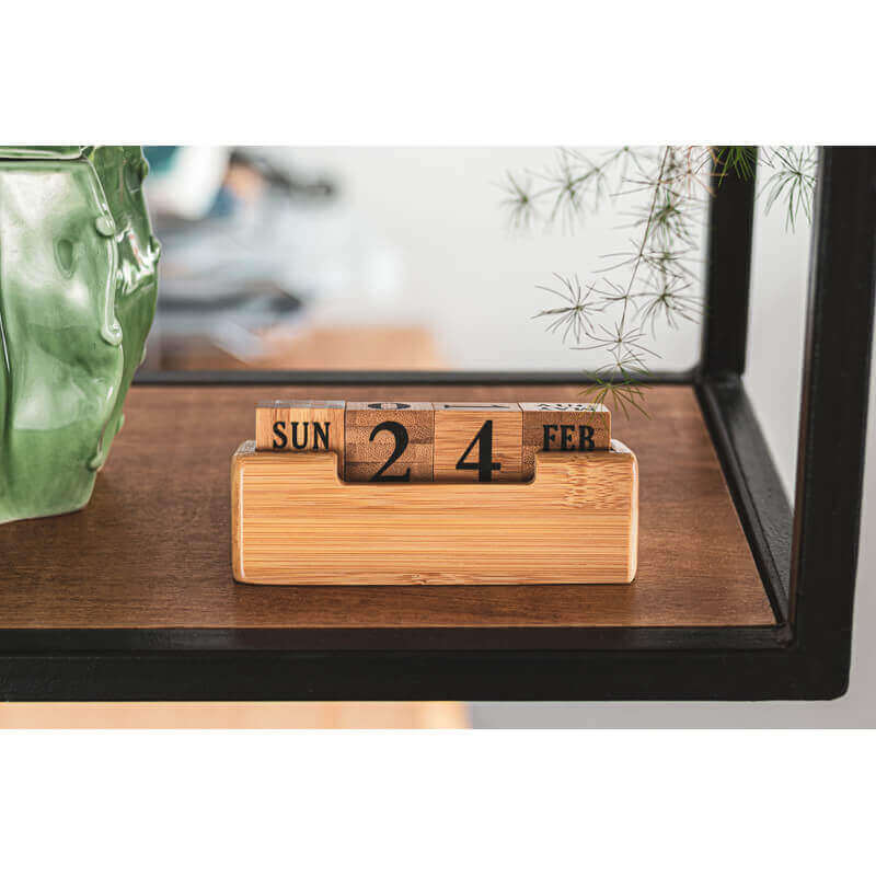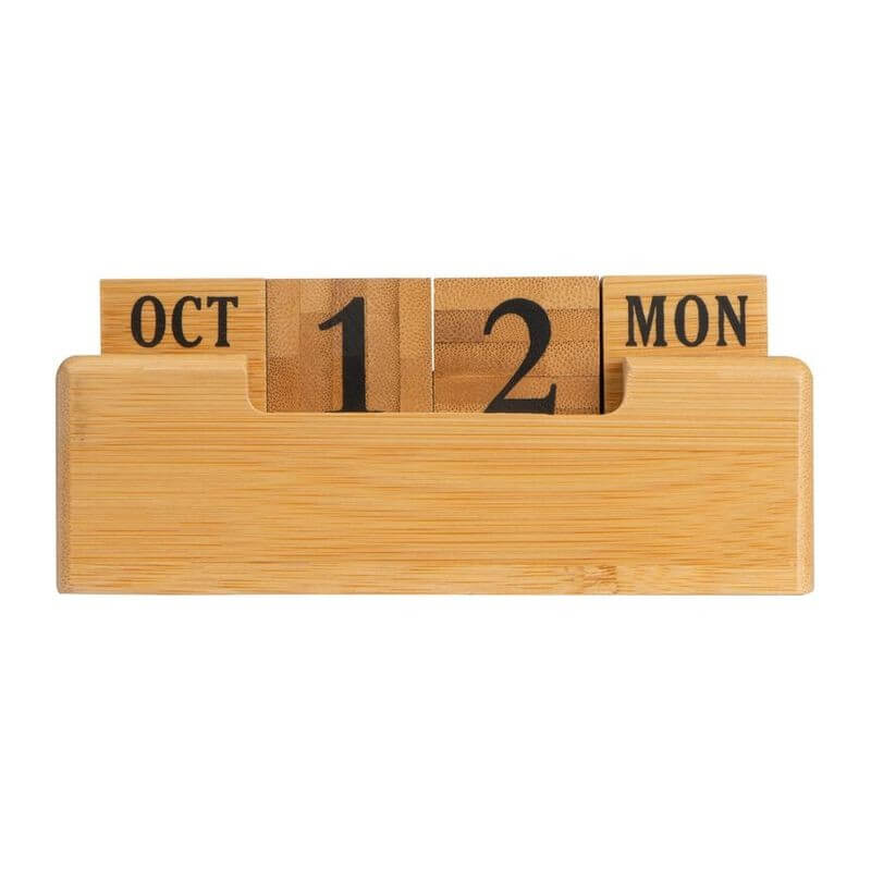 Praktický stolný večný kalendár s protišmykovou spodnou stranou z bambusu, ktorý je každý rok opäť použiteľný! Prírodný materiál môže spôsobiť odlišnosti medzi jednotlivými kusmi v povrchovom vzorovaní a farbe. Spôsob potlače gravírovanie.