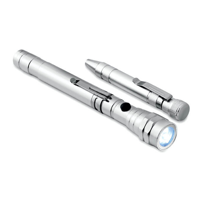 Sada náradia s výsuvnou hliníkovou baterkou s 3 LED žiarovkami a hliníkového multifunkčného náradia v tvare pera. Obsahuje 4 štrbiny a 4 Phillips skrutkovacie nástavce. 4 batérie LR44 súčasťou balenia. Dodávanie v krabici.