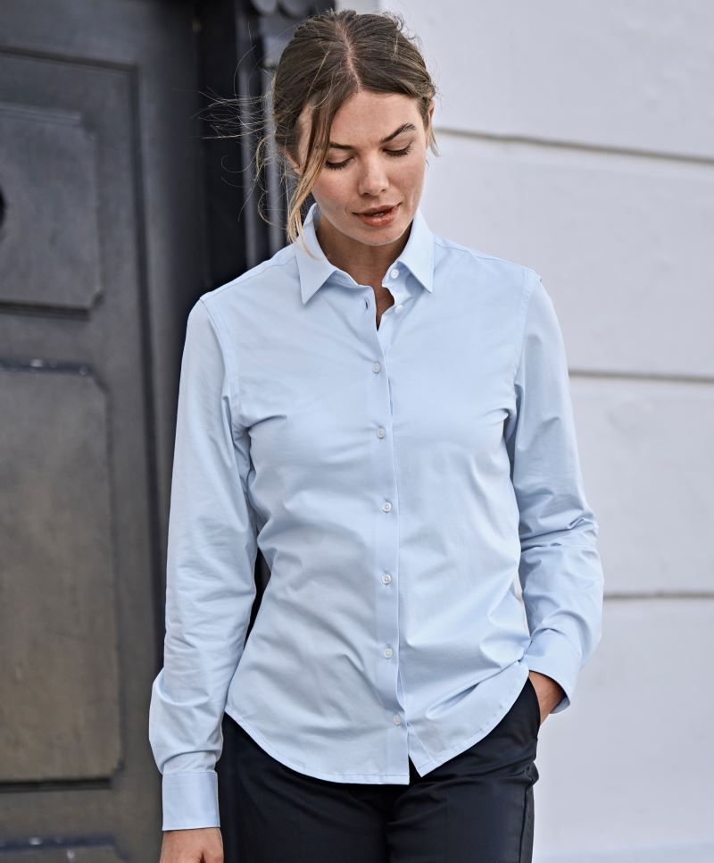 Vypasovaný strih, široký golier, zaoblený lem, zadné sedlo, príjemná elastická látka, mäkká 4-cestná strečová tkanina, regulujúca vlhkosť a rýchloschnúci, prateľné na 40°, Easy Care, nemožno sušiť v sušičke.