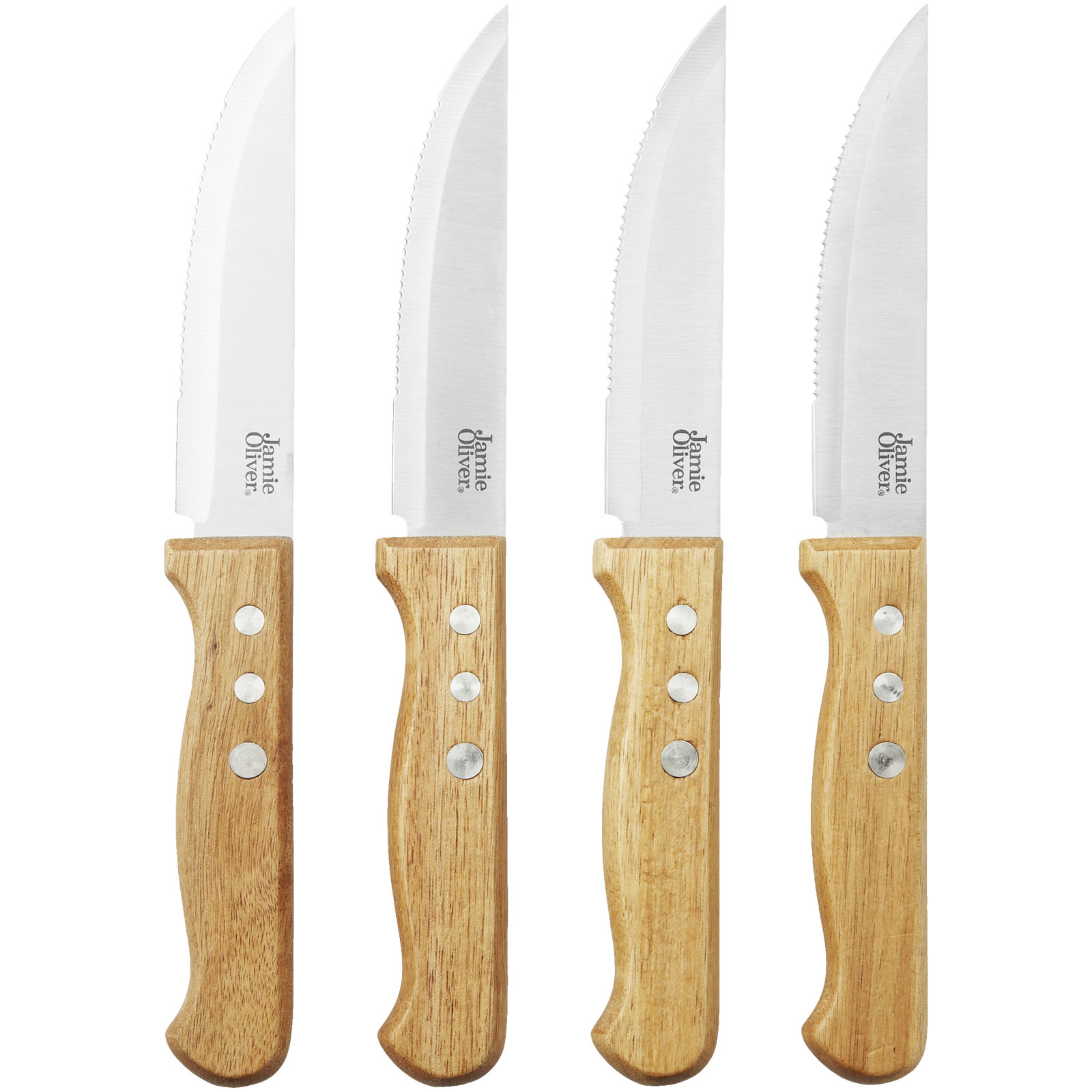 Štvordielna sada steakových nožov Jumbo. Pustite sa s chuťou do svojho obľúbeného pečeného mäsa týmito poriadnymi steakovým nožmi. Dodávané v darčekovej kazete Jamie Oliver. Exkluzívny dizajn. Nerezová oceľ a drevo.