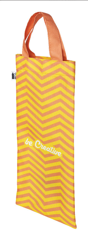 Taška na víno z polyesteru 600D RPET s krátkymi ušami, vyrobená na zákazku. S celoplošnou sublimačnou potlačou a výraznou RPET etiketou. Cena nezahŕňa tlačovú prípravu. Min. mn.: 25 ks. Be Creative. Nosnosť tašky: 2 kg. Objem tašky: 4 l