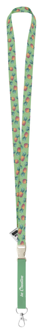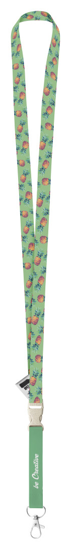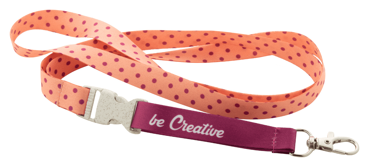 Polyesterový lanyard 15 mm RPET na zákazku s oddeliteľnou kovovou karabínkou a bezpečnostnou prackou z pšeničnej slamy, so sublimovanou potlačou na oboch stranách.