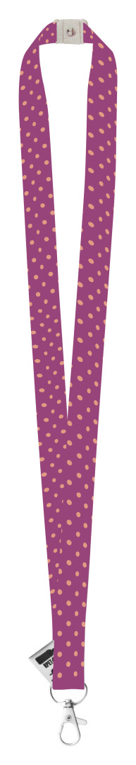 Polyesterový lanyard RPET na zákazku s kovovou karabínkou a bezpečnostnou prackou z pšeničnej slamy, so sublimovanou potlačou na oboch stranách.