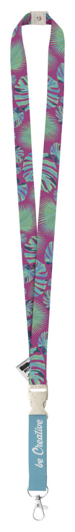 Polyesterový lanyard RPET na zákazku s kovovou karabínkou a bezpečnostnou prackou z pšeničnej slamy, so sublimovanou potlačou na oboch stranách.