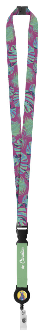 Polyesterový lanyard na zákazku s oddeliteľným teleskopickým Pripinák a bezpečnostnou prackou. Cena zahŕňa sublimačná potlač na oboch stranách, nezahŕňa tlačovú prípravu. Min. mn .: 100 ks.