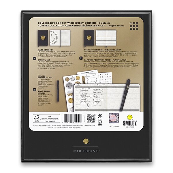 Súprava Moleskine SMILEY obsahuje čierny nedatovaný diár veľkosti L, zápisník veľkosti L a čierny roller Kaweco v darčekovom boxe. Limitovaná edícia SMILEY je vydávána k 50ročnému výročiu. SMILEY je priekopníkom tzv. pozitívnej žurnalistiky s heslom Take the Time to Smile (Urobte si čas na úsmev). Kreativita nás robí šťastnými a šťastie nás robí kreatívnymi, takže zdvihni pero alebo ceruzku a začni brať svoje šťastie vážne.