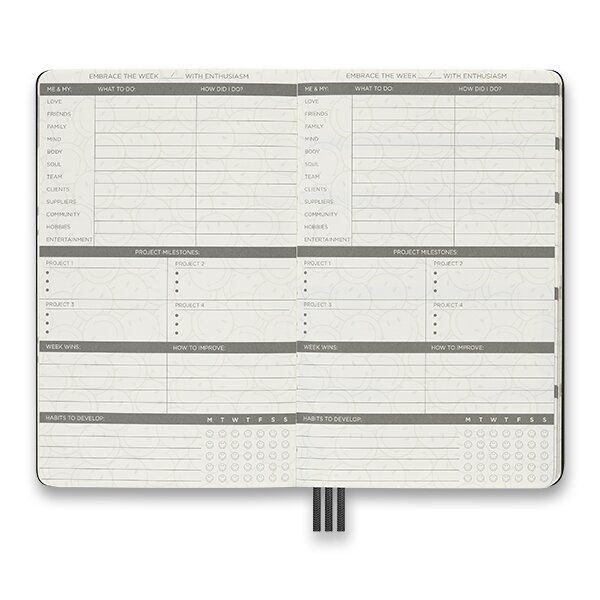 Diár má pevnú, v chrbte šitou väzbu v kartónových doskách. Vnútorná časť, rovnako ako dosky, sú tematicky zdobené prvkami SMILEY. Obopína ho pružná gumička proti samovoľnému otváraniu. Obsahuje praktické vnútorné vrecko na vizitky a dokumenty, textilnú záložku a leták s históriou MOLESKINE. Mesačný, týždenný a denný prehľad. Papier s gramážou 100 g/m², neobsahuje kyseliny.