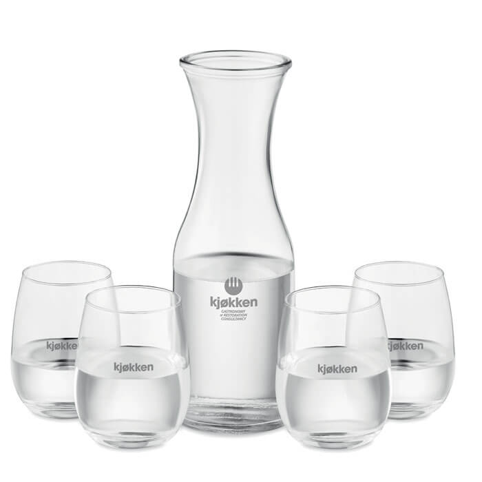 Súprava na nápoje z recyklovaného skla. Karafa (1 l) s korkovým viečkom a 4 poháre (420 ml). Podávajte čerstvé nápoje s touto štýlovou sadou sklenenej karafy a pohárov. Korkové viečko dodáva karafe prírodný vzhľad. Vďaka korku a recyklovanému sklu je táto sada efektnou udržateľnou voľbou.