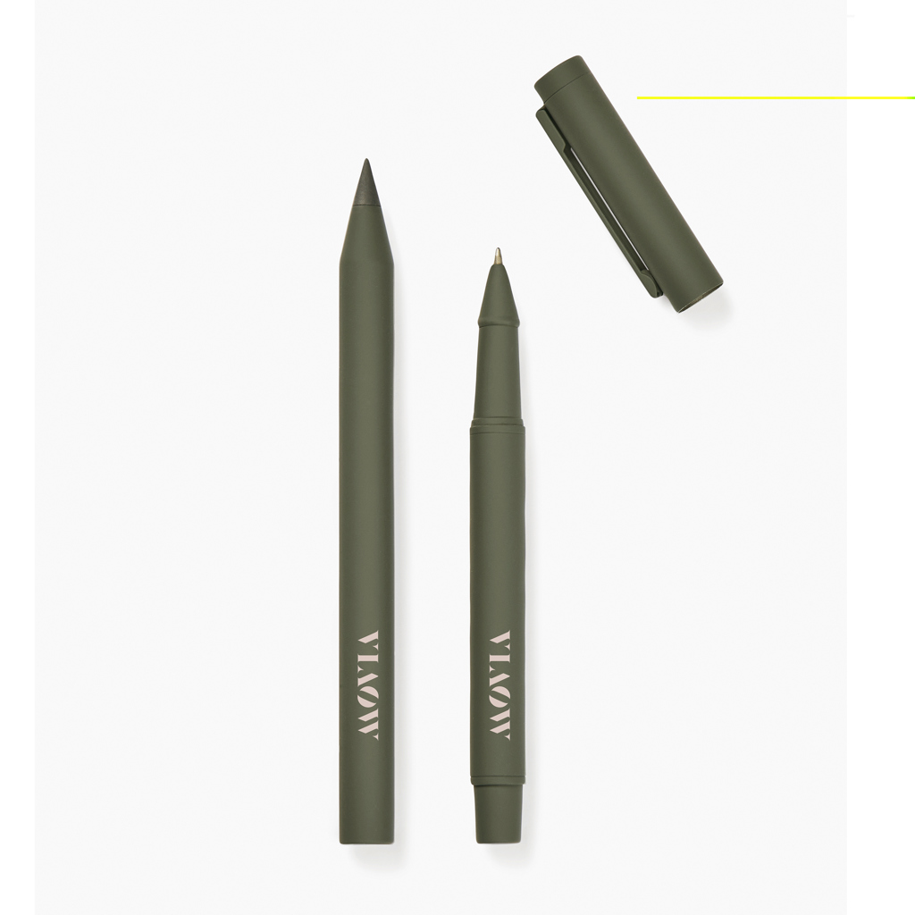 Táto moderná a elegantná sada obsahuje dve perá: "večné" pero a klasické guličkové pero. Perá sú vyrobené z recyklovanej nerezovej ocele s certifikátom RCS, majú pogumovaný povrch pre pohodlný úchop a matnú povrchovú úpravu. Obe perá majú vyváženú hmotnosť, ktorá zaisťuje stabilitu a písanie bez námahy. "Večné" pero ponúka neobmedzené písanie. Guľôčkové pero je vybavené jemným hrotom s priemerom 1,00 mm a poskytuje hladké a konzistentné písanie modrým atramentom s výdržou až 1200 metrov. Certifikácia RCS zaručuje, že celý dodávateľský reťazec recyklovaných materiálov je certifikovaný. Celkový obsah recyklovaných materiálov sa odvíja od celkovej hmotnosti výrobku. Tento výrobok obsahuje 52% recyklovaného hliníka s certifikáciou RCS a 10% nerezovej ocele s certifikáciou RCS.