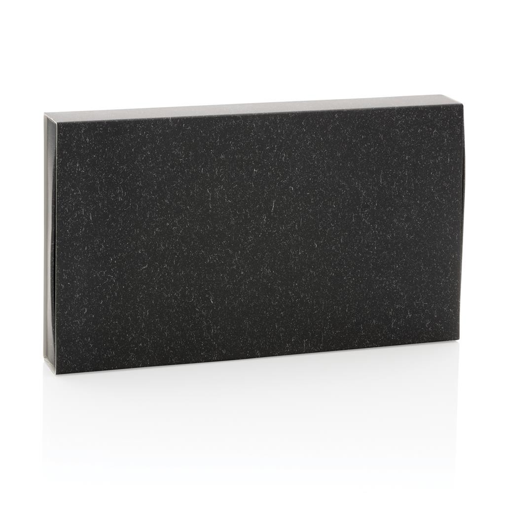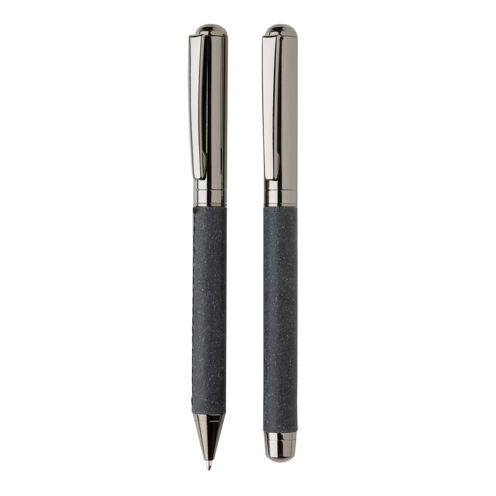 Styová sada pier z recyklovanej kože obsahuje jedno guľôčkové pero a jeden roller. Obe perá obsahujú kvalitný atrament Dokumental v modrej farbe. Dĺžka písania guličkového pera: 1 200 m, rollera: 400 m. Balené v puzdre z recyklovanej kože a darčekovej krabičke so vzorom recyklovanej kože.