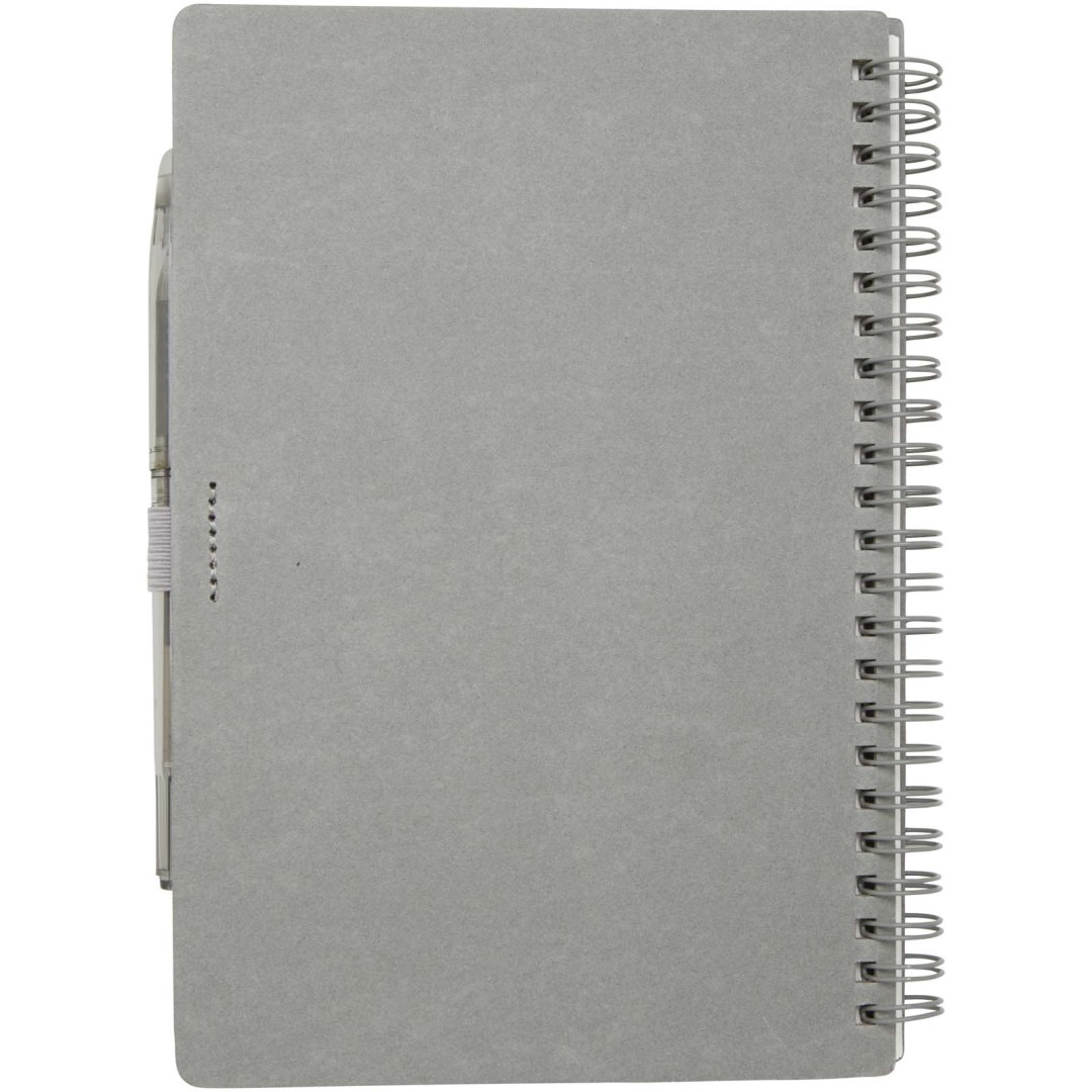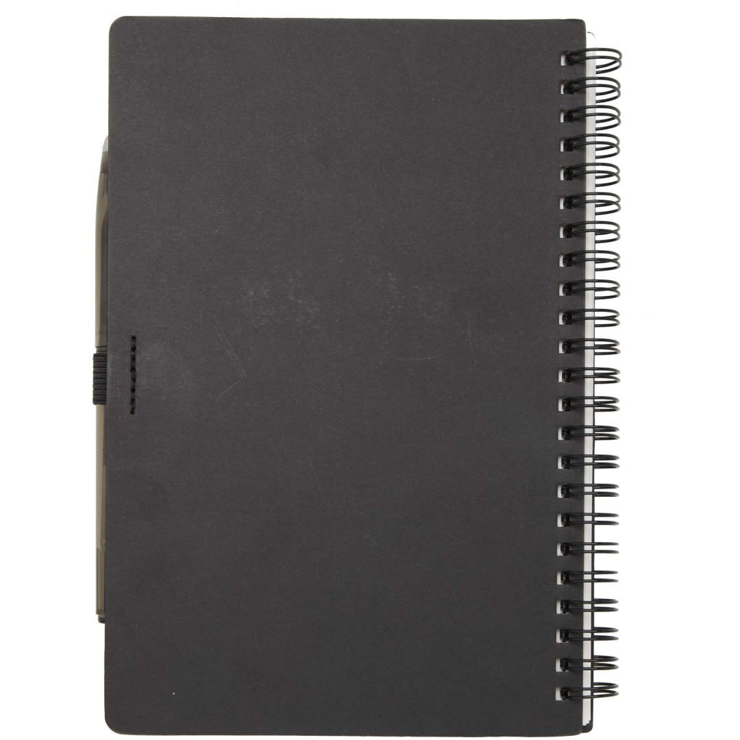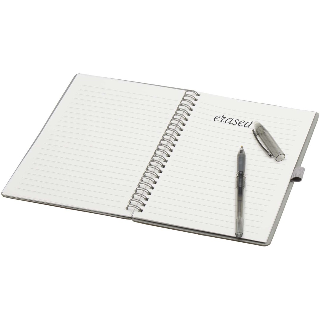 Súprava pera a zápisníka z kamenného papiera na opakované použitie. Zápisník má obálku z lepenky, zaoblené rohy a 32 listov linkovaného papiera s gramážou 120 g/m². Kamenný papier je vyrobený úplne bez použitia stromov a výrobný proces spotrebováva menej energie v porovnaní s recyklovaným alebo novým papierom z celulózy. Na zadnej strane je vrecko na čiernu handričku (súčasťou balenia). Mazacie pero z recyklovaného plastu s priehľadným telom, bielou gumou hore a nepriehľadným úchopom. Farba atramentu: Čierna. Dĺžka písania: 250 metrov. Rozmer hrotu: 0,7 mm.