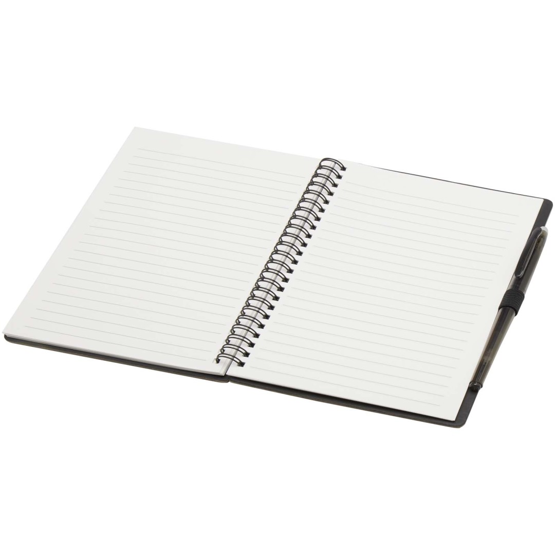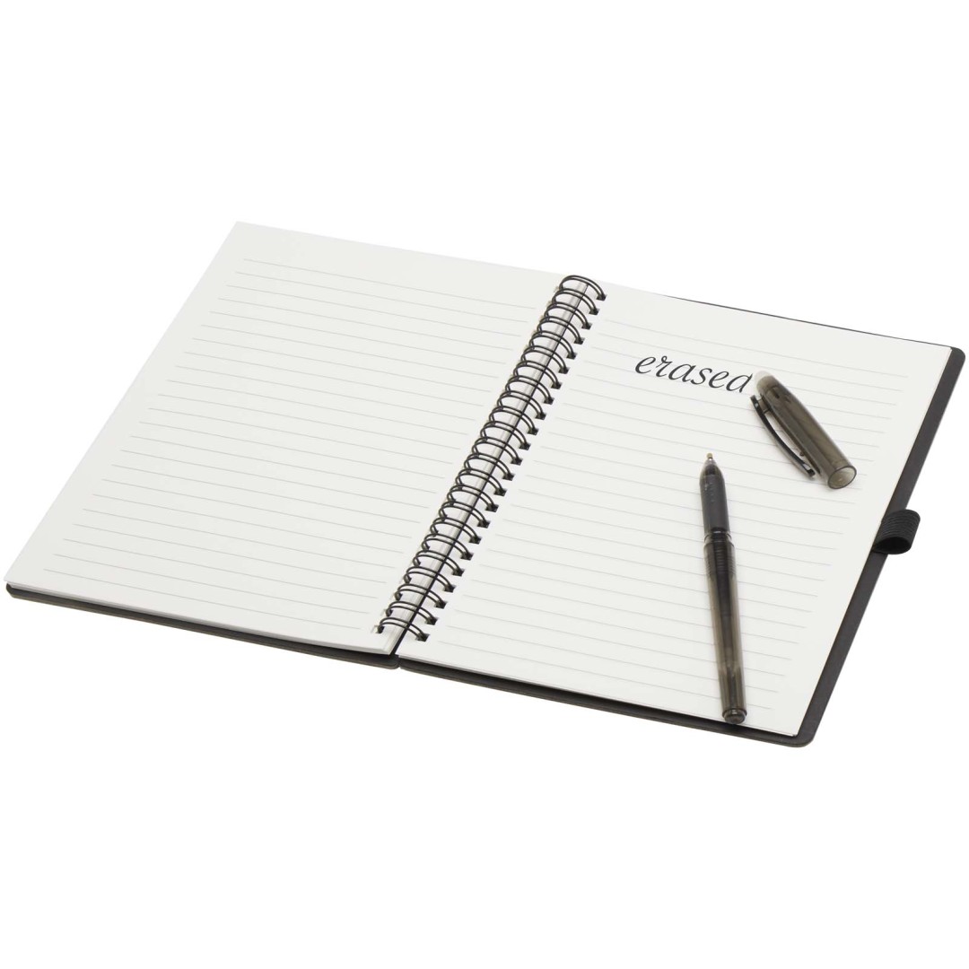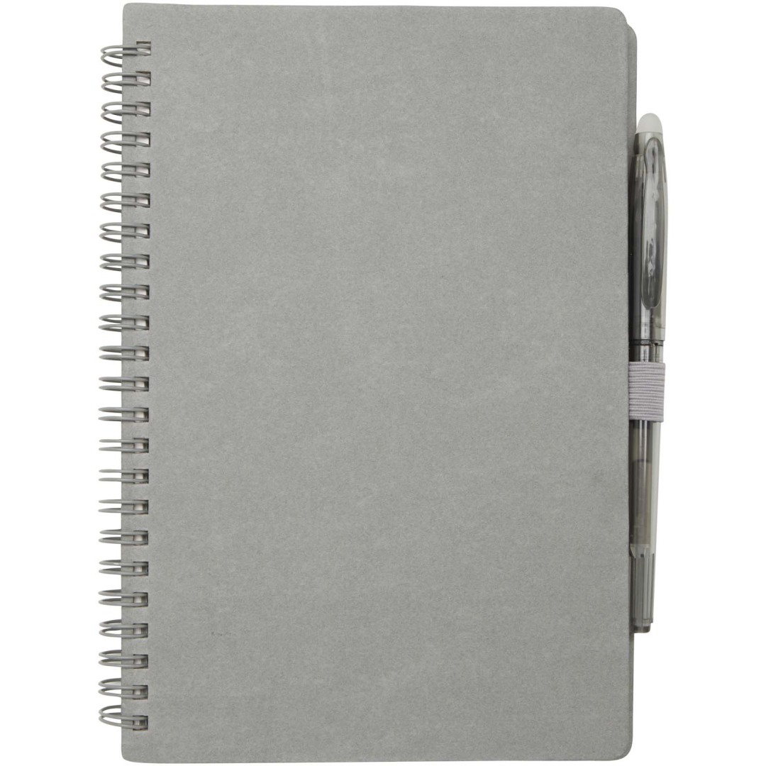 Súprava pera a zápisníka z kamenného papiera na opakované použitie. Zápisník má obálku z lepenky, zaoblené rohy a 32 listov linkovaného papiera s gramážou 120 g/m². Kamenný papier je vyrobený úplne bez použitia stromov a výrobný proces spotrebováva menej energie v porovnaní s recyklovaným alebo novým papierom z celulózy. Na zadnej strane je vrecko na čiernu handričku (súčasťou balenia). Mazacie pero z recyklovaného plastu s priehľadným telom, bielou gumou hore a nepriehľadným úchopom. Farba atramentu: Čierna. Dĺžka písania: 250 metrov. Rozmer hrotu: 0,7 mm.
