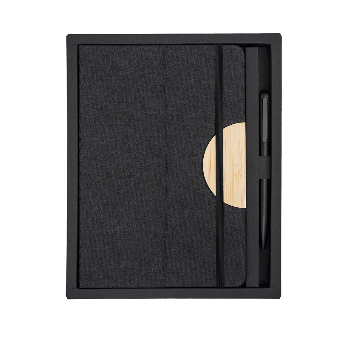 Súprava obsahuje zápisník s bambusovým lemom a pero z hliníka s matným povrchom a modrou náplňou. Pevnú väzbu zápisníka môžete premeniť na stojan na mobil. Zápisník má 160 linkovaných strán (70 g/m2), zatváranie na elastickú pásku a stužku na založenie stránok. Balené v čiernej darčekovej krabičke.