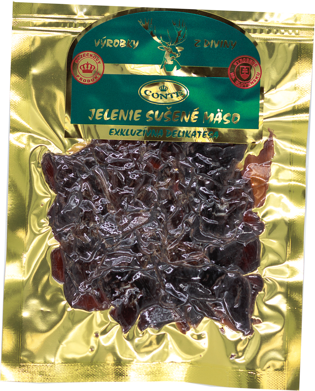 Sušené jelenie mäso – delikatesa z najkvalitnejšieho voľne žijúceho jelenieho stehenného mäsa, konzervované jedlou soľou. Balenie vákuové, 40 g (±10 %). Na výrobu 100 g produktu sa použilo 250 g surového mäsa. Skladovanie: pri 0–20 °C, po otvorení spotrebujte do 48 h. Chrániť pred slnkom a mrazom.