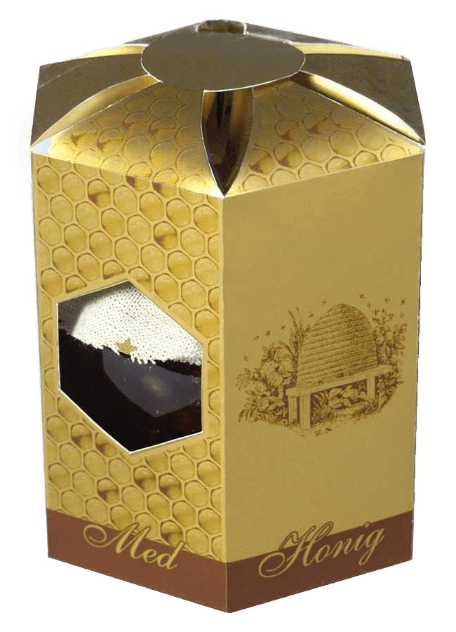 Sušené ovocie v mede podľa vlastného výberu balené v zlatej šesťuholníkovej krabici. Je vhodé ako samostatný darček alebo do darčekového balíčka.