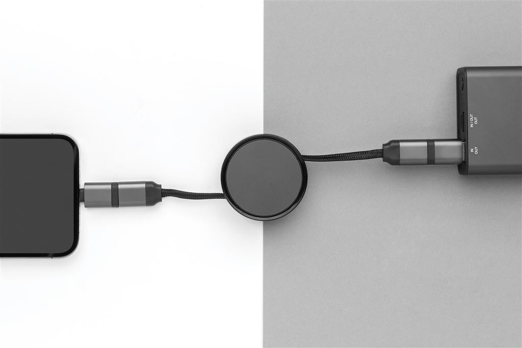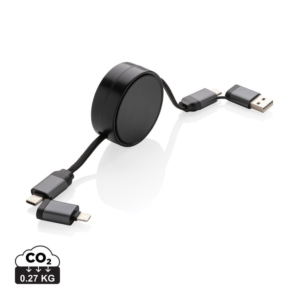 Zvinovací nabíjací kábel 6 v 1 vyrobený z RCS recyklovaného hliníka, TPE a ABS. RCS (Recycled Claim Standard) je globálny štandard, ktorý umožňuje overiť použitie recyklovaného materiálu v produkte naprieč celým dodávateľským reťazcom. Celkový podiel recyklátu podľa váhy produktu: 68 %. Hliník pri recyklácii nestráca svoje vlastnosti, je možné tak recyklovať opakovane. Kábel disponuje 5 konektormi: USB C/USB vstup, USB C/micro USB/iOS výstup. USB C je vhodné na nabíjanie moderných telefónov, ale aj notebookov. Kábel s maximálnou dĺžkou 100cm je opletený RCS recyklovaným PET pre vyššiu odolnosť. Podporuje prenos dát (len USB C-USB C). Podporuje rýchlonabíjanie až 45W. Balené v FSC® darčekovom balení.