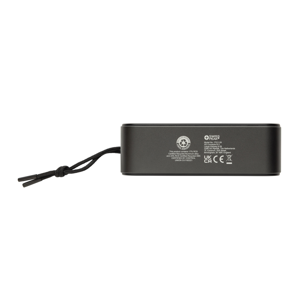 Swiss Peak 10W reproduktor z recyklovaného hliníka RCS prináša výkonný a kvalitný zvuk s hlbokými, rezonančnými basmi vďaka integrovanému subwooferu a duálnym 10W reproduktorom. Je navrhnutý pre špičkový zvukový výkon, disponuje technológiou BT 5.3 pre plynulé pripojenie a automatické párovanie so zariadeniami. Vstavaná polymérová Li-ion batéria s kapacitou 1200 mAh umožňuje až 5 hodín prehrávania pri 50 % hlasitosti a plné nabitie za 2,5 hodiny pomocou pribaleného USB-C na USB-C kábla. Medzi ďalšie funkcie patrí USB-C port a AUX vstup. Reproduktor je vyrobený z recyklovaného hliníka s certifikáciou RCS. RCS (Recycled Claim Standard) je štandard na overenie recyklovaného obsahu produktu v rámci celého dodávateľského reťazca. Celkový recyklovaný obsah: 40 % na základe celkovej hmotnosti položky. Tento reproduktor neobsahuje PVC a je zabalený v darčekovej krabici s certifikátom FSC. Obsahuje aj popruh na prenášanie z recyklovaného RPET materiálu.