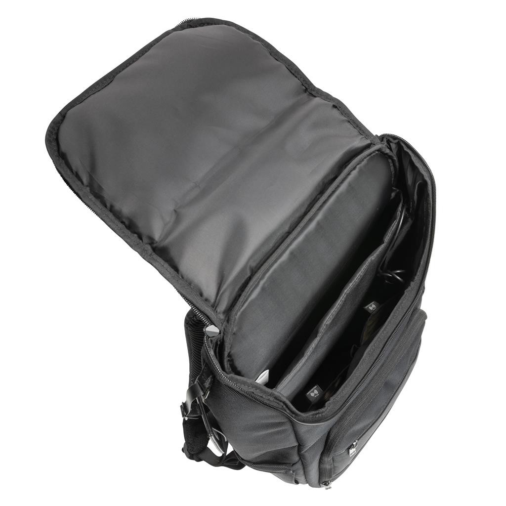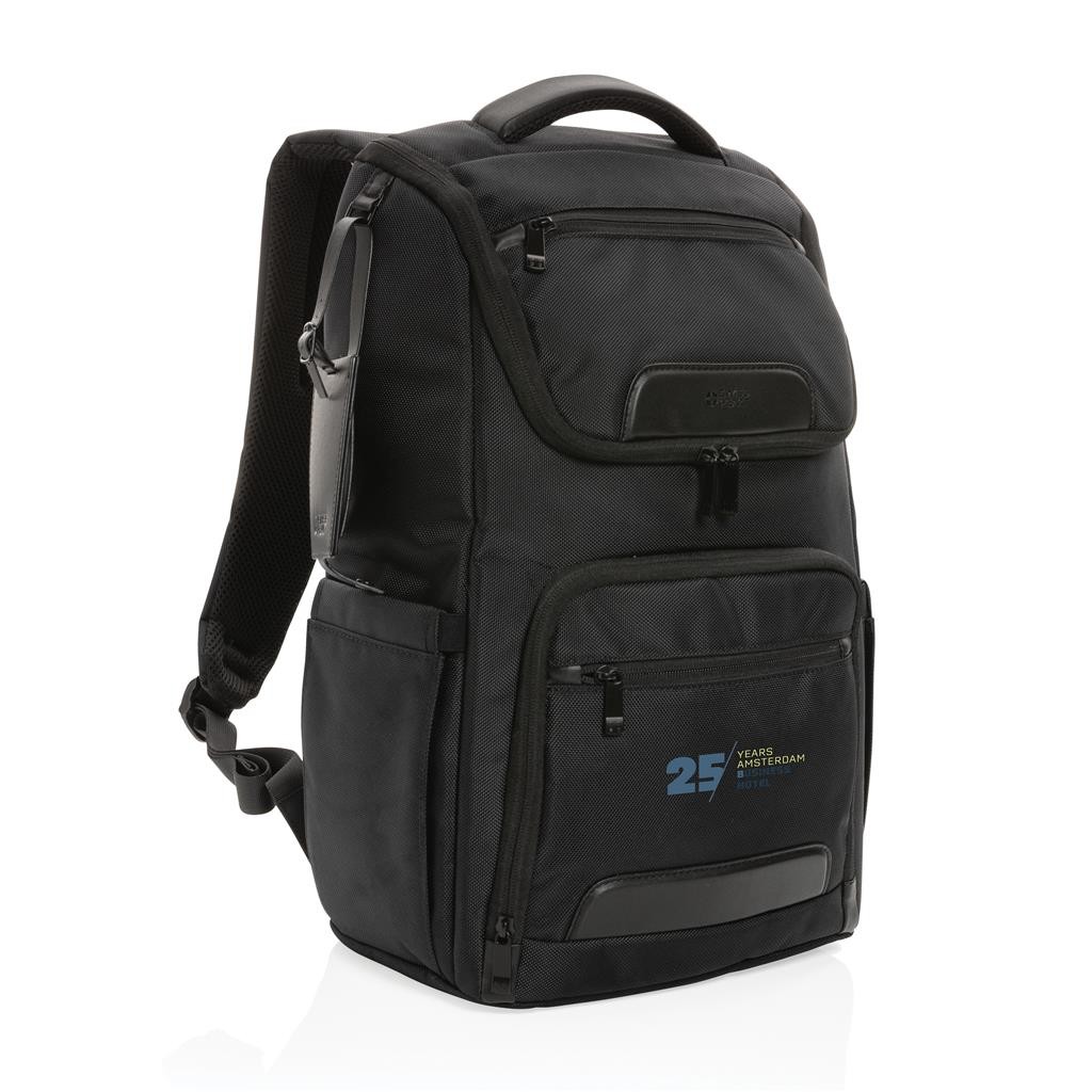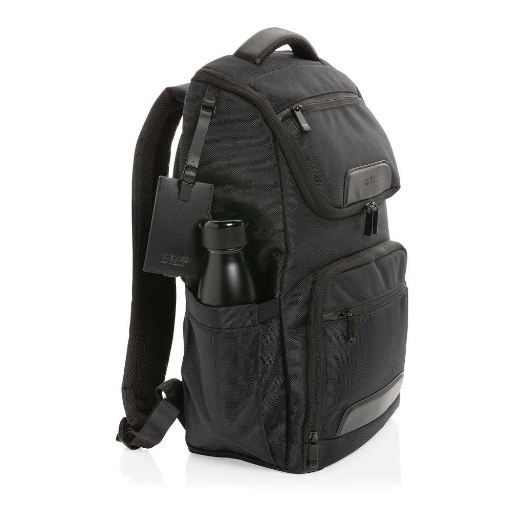 Elegantný skvele vybavený batoh na každodenné cestovanie. Vyrobený z pevného recyklovaného polyesteru 1680D s bohatými detailmi z umelej kože. Prakticky navrhnutý dizajn s množstvom vreciek. Priestranný hlavný oddiel, polstrovaný oddiel na 15,6" notebook, dodatočné menšie vrecko na zips. USB výstup pre nabíjanie telefónu na cestách, vrecká s RFID ochranou, pútka na perá, postranné vrecko na fľašu a odnímateľný kontaktný štítok. Zloženie: vonkajšia časť: 100 % 1680D recyklovaný polyester, vnútorná časť (podšívka): 150D recyklovaný polyester Vrátane skenovateľnej zložky AWARE™ garantujúcej obsah recyklátu. Na výrobu bolo využitých 49,92 500ml PET fliaš a bolo usporených 29,8 litrov vody. Navyše prispelo 2 % na podporu iniciatívy Water.org.
