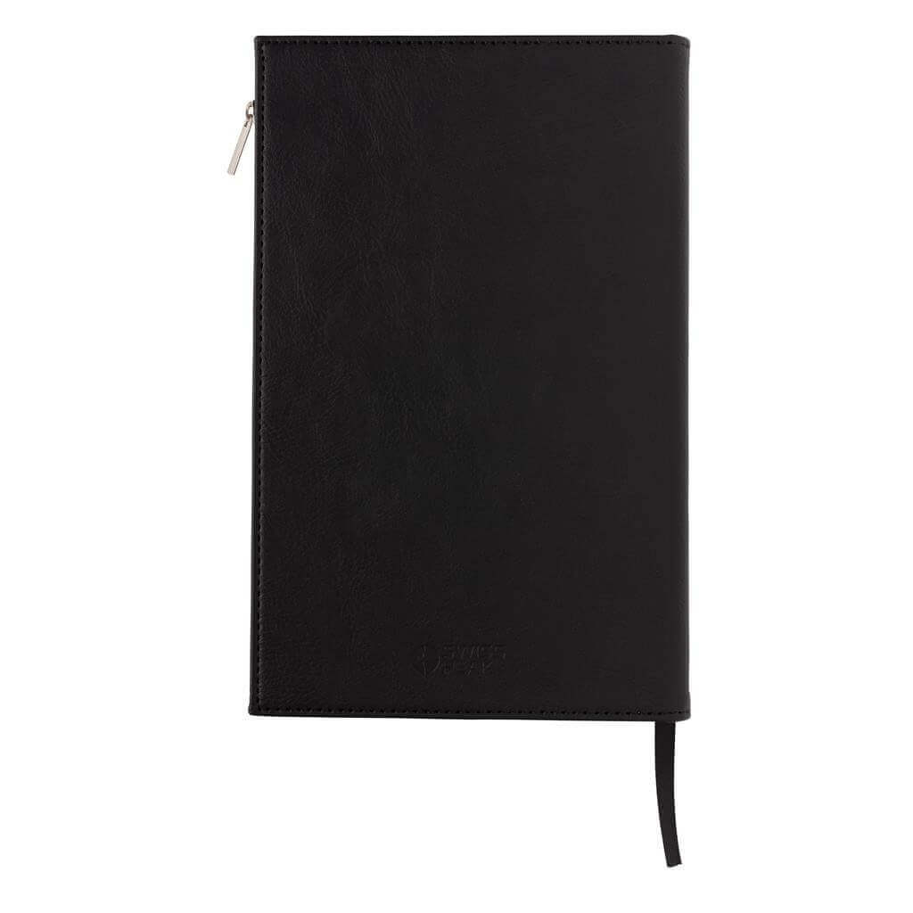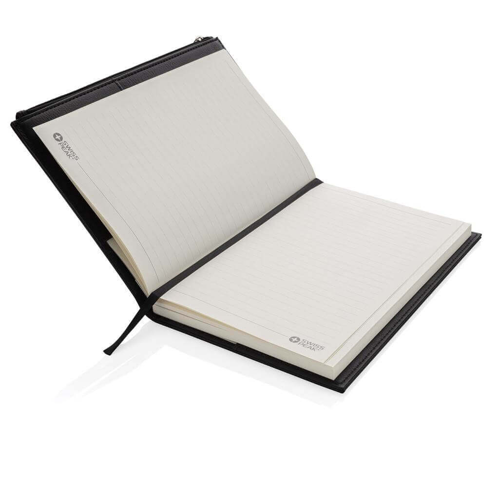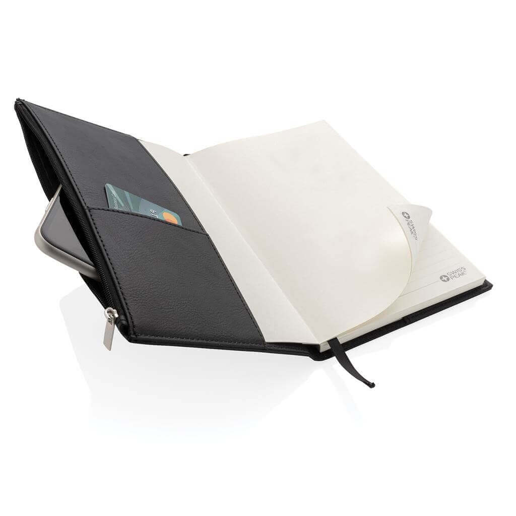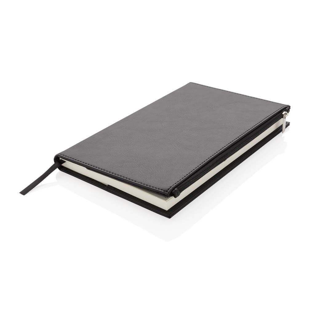 Štýlový poznámkový blok s obalom z umelej kože (PU) vo formáte A5. Praktické vrecko na zips na prednej strane pre uchovanie drobností. Obsahuje 80 listov/160 strán krémového linkovaného papiera o gramáži 80g/m2. Balené v luxusnej darčekovej krabičke.