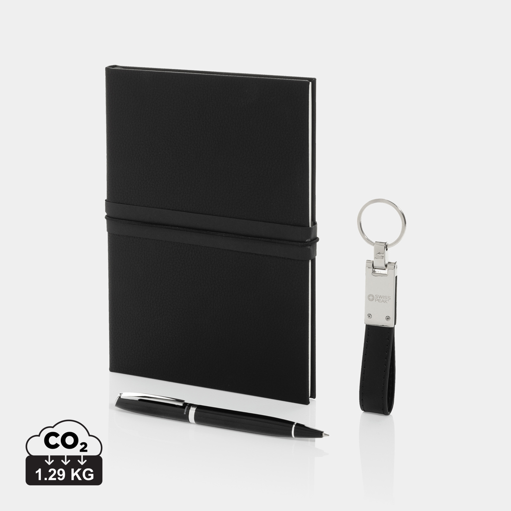 Táto luxusná základná darčeková sada obsahuje tie najpotrebnejšie každodenné doplnky. Aby ste mali svoje najdôležitejšie kľúče vždy po ruke, sada obsahuje prémiovú kľúčenku značky Swiss Peak s lesklým kovovým povrchom a elegantným PU koženým remienkom. Potrebujete si zapísať nápad alebo poznámku? Sada obsahuje aj štýlové guľôčkové pero s kapacitou písania až 1000 metrov a notebook s mäkkým PU obalom z recyklovaného polyesteru. Zápisník obsahuje 160 krémových strán z recyklovaného papiera. Všetky položky v sade sú certifikované podľa RCS (Recycled Claim Standard), čo zaručuje plne overený dodávateľský reťazec pre použité recyklované materiály. Celkovo sú výrobky v tejto sade zložené zo 75 % recyklovaného obsahu.