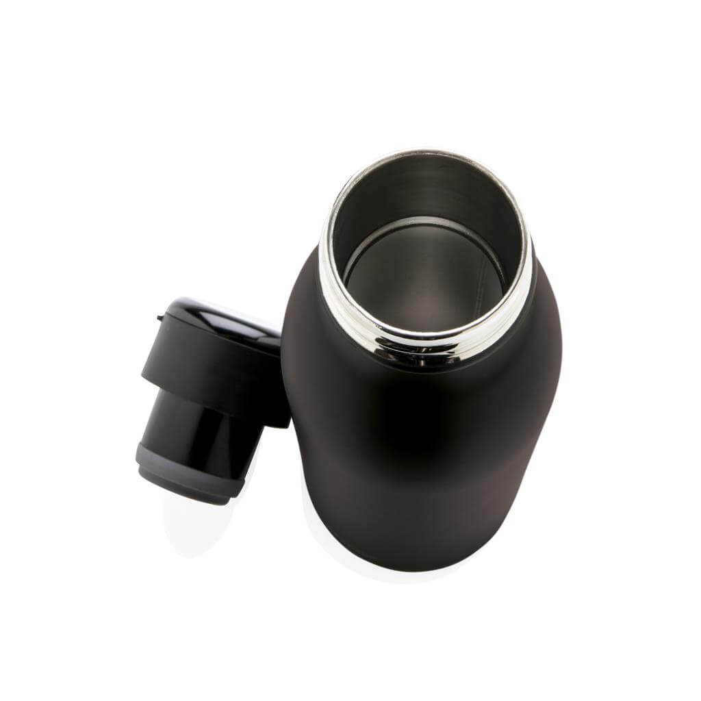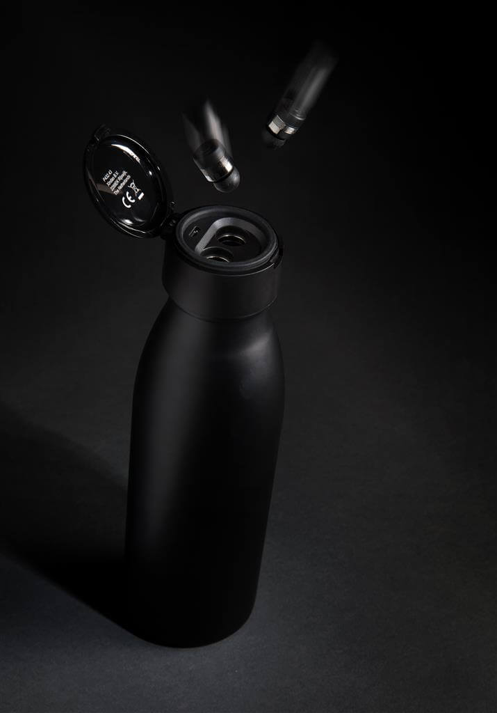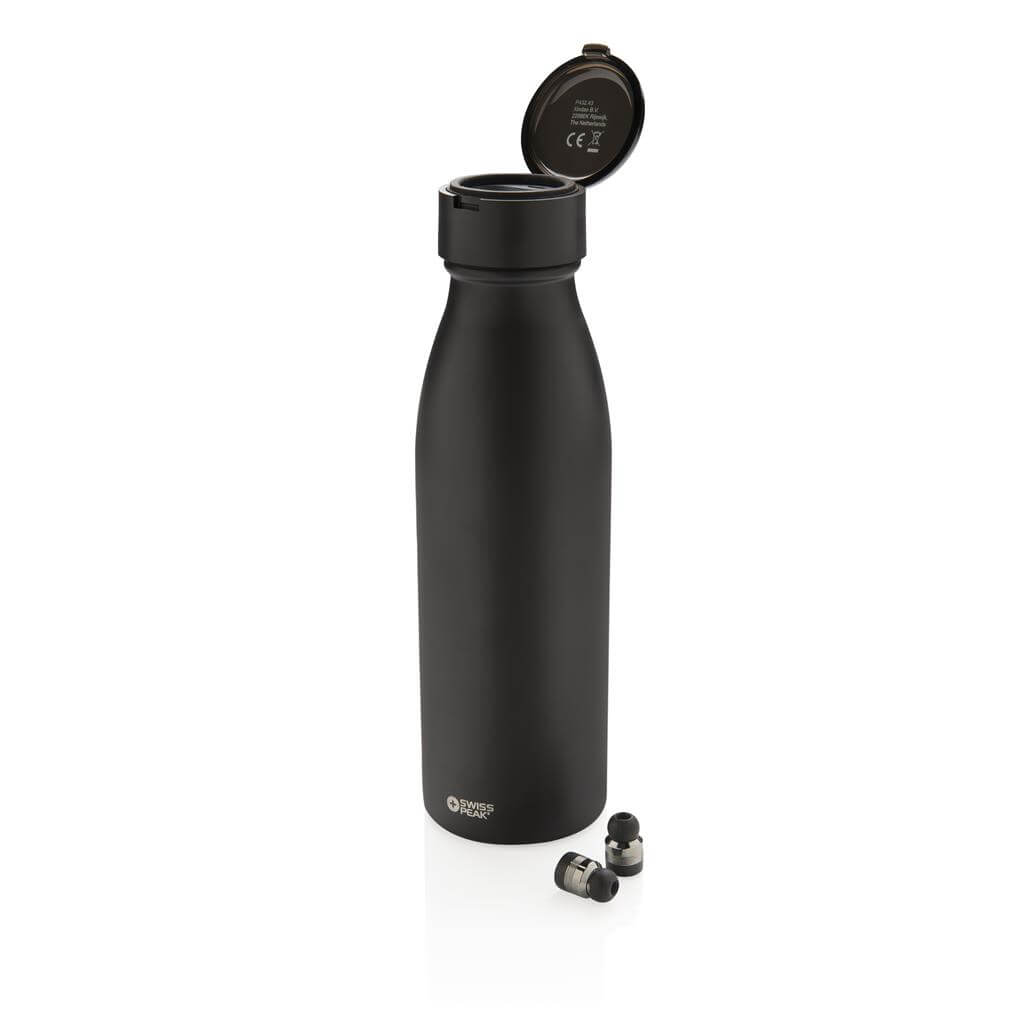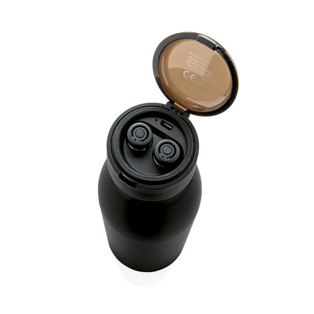 Nepriepustná dvojstenná termo fľaša s párom naozaj bezdrôtových slúchadiel uschovaných vo viečku. Vďaka 40 mAh batérii umožňuje nepretržité počúvanie hudby až po dobu 2 hodín. Vrátane 60 cm dlhého nabíjacieho kábla micro USB. Vyrobené z nerezovej ocele (vnútri 304 SS, vonku 201 SS) uchovávajúci vaše nápoje horúce až po dobu 5h a studené až 15h. Objem 580 ml. 1 batéria typu rechargeable súčasť balenia.