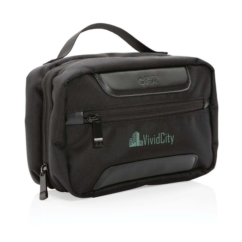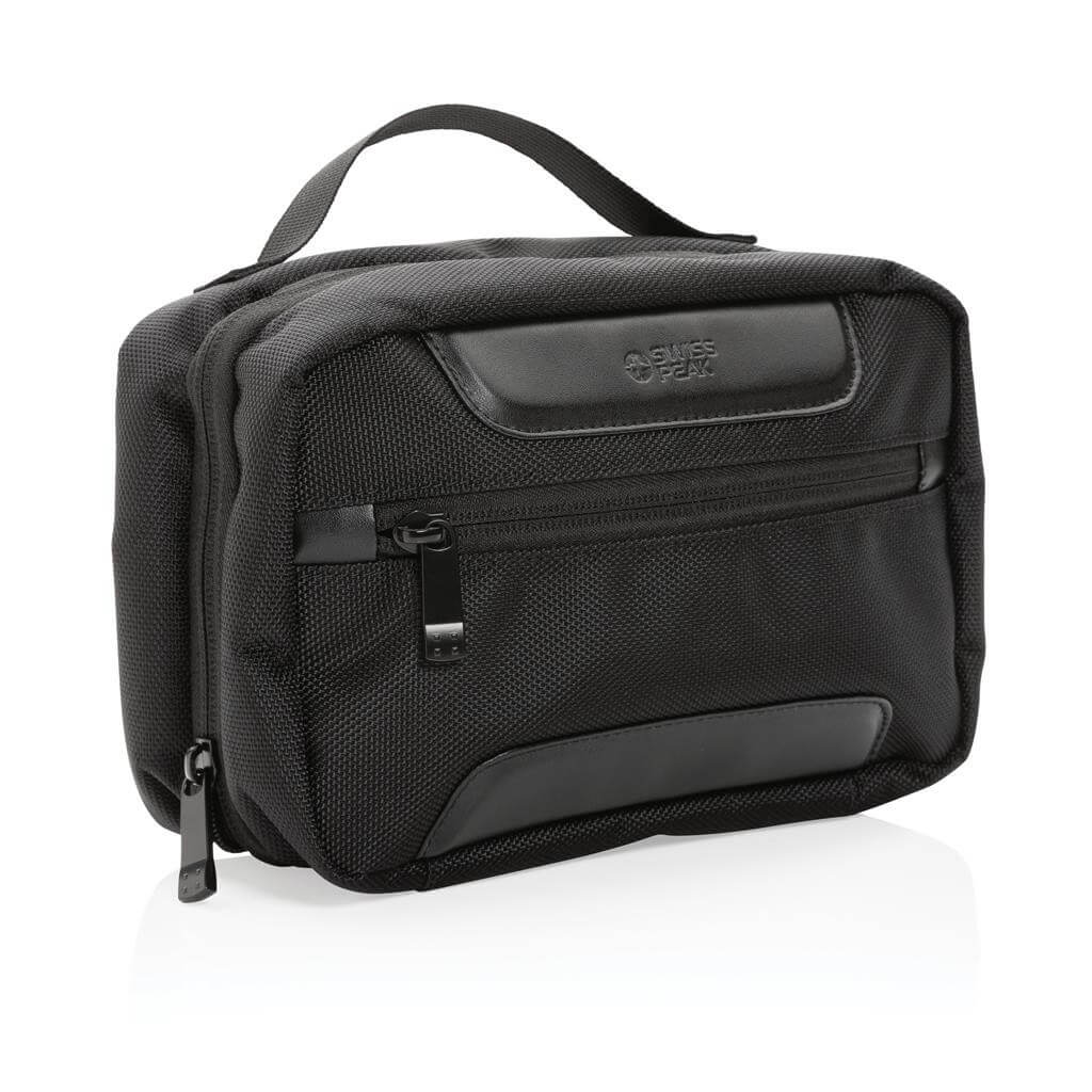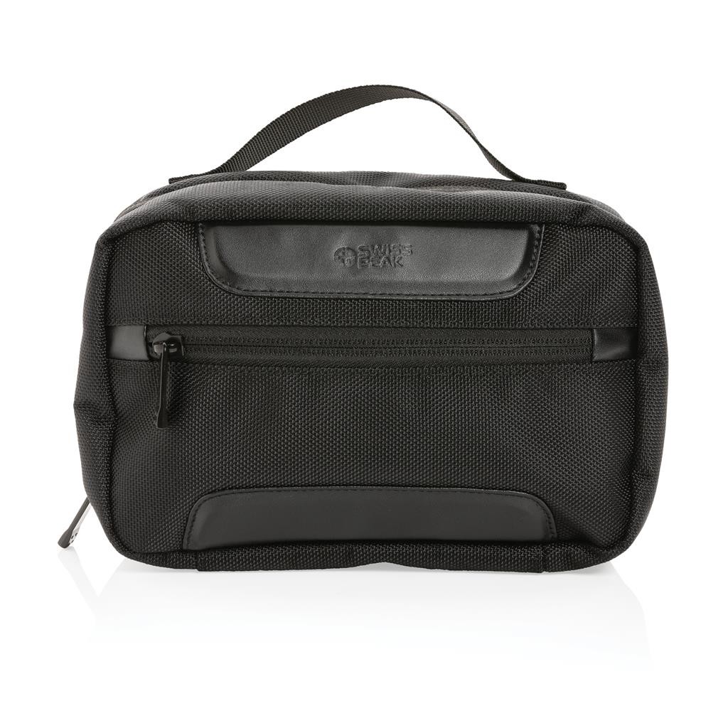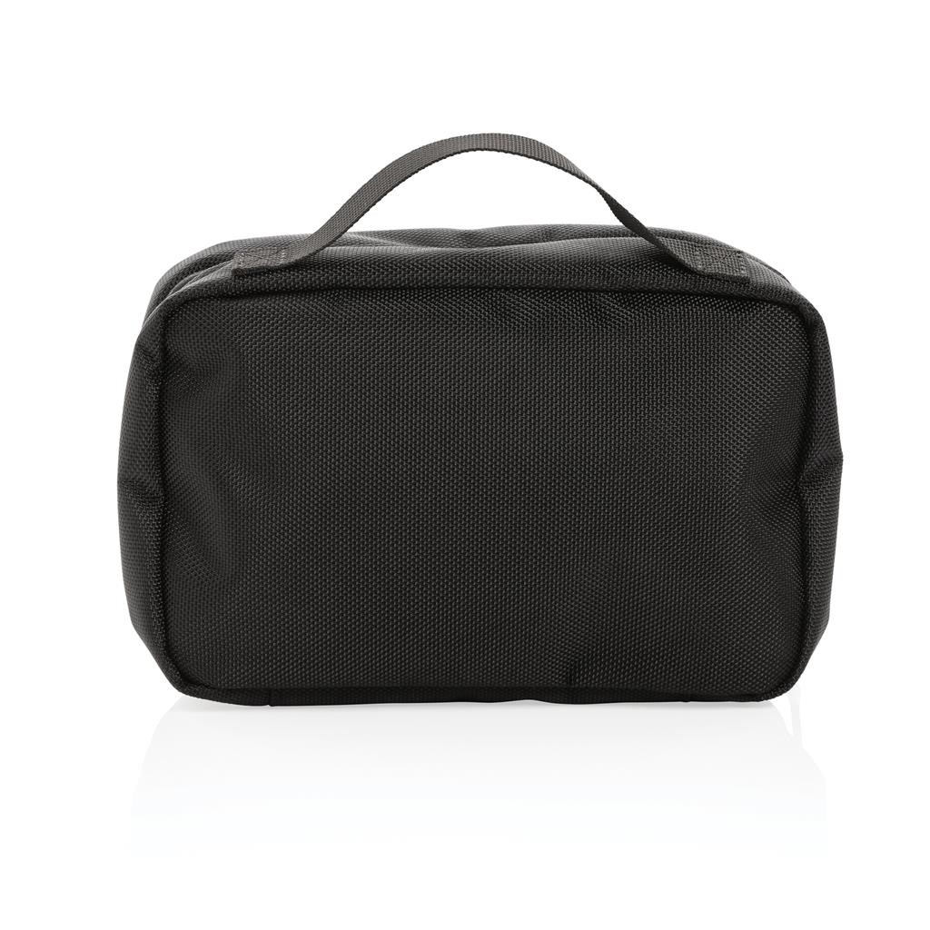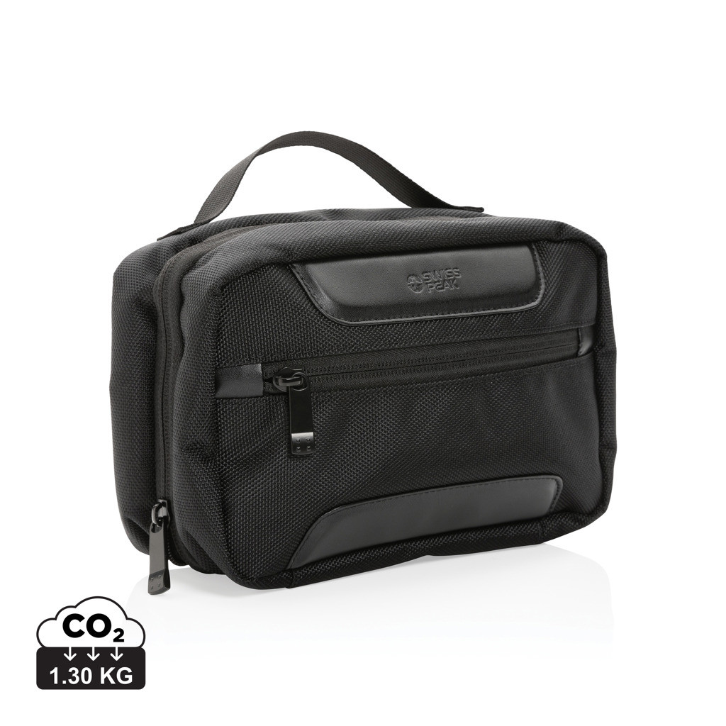 Praktická toaletná taška ideálna pre cestovateľov alebo elegantné uschovanie toaletných potrieb. Vyrobená z pevného recyklovaného polyesteru 1680D s bohatými detailami z umelej kože. Dva priestranné oddiely na zips. Zloženie: vonkajšia časť: 100% 1680D recyklovaný polyester; vnútorná časť (podšívka): 150D recyklovaný polyester. Vrátane skenovateľnej zložky AWARE™ garantujúcej obsah recyklátu. Na výrobu bolo využitých 10,14 500ml PET fliaš a bolo usporených 6 litrov vody. Z výťažku každého predaného produktu je navyše prispených 2 % na podporu iniciatívy Water.org.