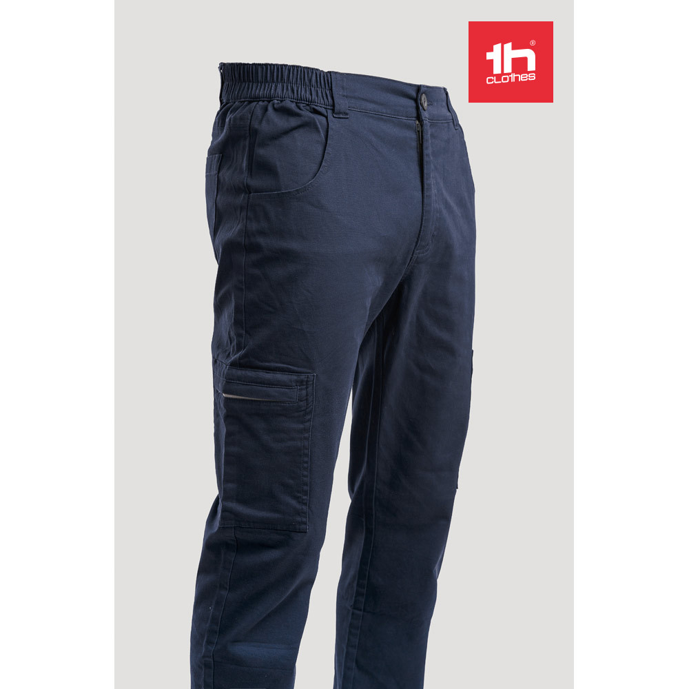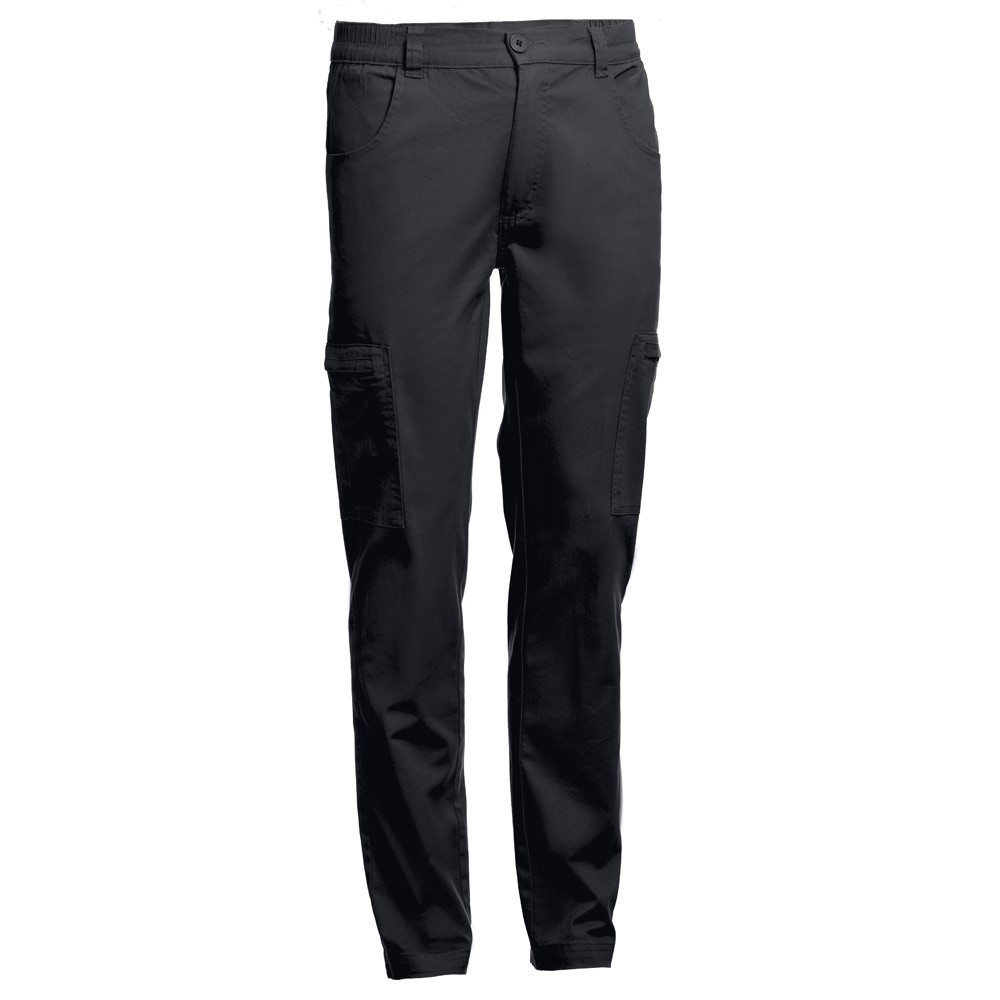 Pánske pracovné nohavice. 98% bavlna a 2% spandex: 240 g/m². 6 vreciek: 2 bočné vrecká na zips, 2 predné vrecká a 2 zadné vrecká. Pružný pás na bočných stranách. Priliehavý strih. Veľkosti: S, M, L, XL, XXL, 3XL