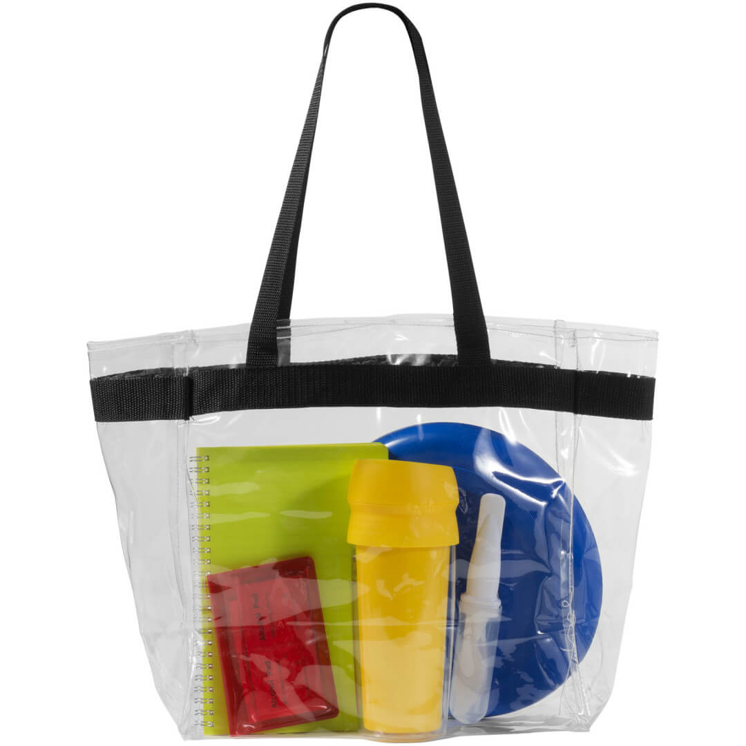Taška Hampton. Táto priehľadná taška je ideálna pre fanúšikov, aby mohli bezpečne prenášať svoje predmety na štadión a ďalšie akcie. Rovnako skvele zaistí bezpečný prenos vecí do práce alebo do školy. Otvorený hlavný priestor so športovým lemom z tkaného pásku a dvojitými uchami. Nosná výška popruhov 24 cm. Príslušenstvo nie je súčasťou. PVC.