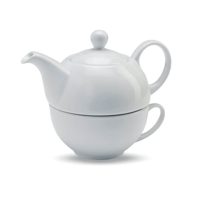 Biela keramická čajová sada, obsahuje 400 ml kanvicu a šálku. Balené v čiernej darčekovej krabici.