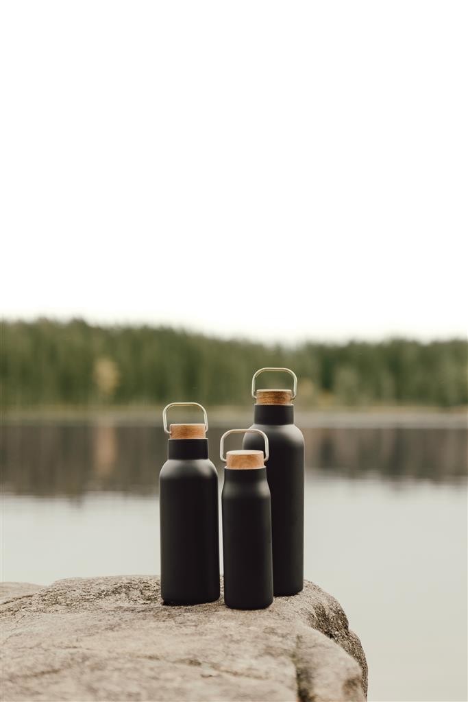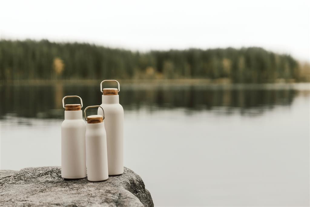 Elegantná termo fľaša Ciro s uzáverom z akáciového dreva s kovovým pútkom pre ľahký prenos. Dvojitá stena z RCS certifikovanej recyklovanej ocele na uchovanie nápoja horúceho alebo studeného po dlhú dobu. RCS (Recycled Claim Standard) je globálny štandard, ktorý umožňuje overiť použitie recyklovaného materiálu v produkte naprieč celým dodávateľským reťazcom. Celkový podiel recyklátu podľa váhy produktu: 79 %. Fľaša sa dá ľahko čistiť, iba na ručné umývanie. Balené v FSC® darčekovej kraftovej krabičke. Objem: 800 ml.