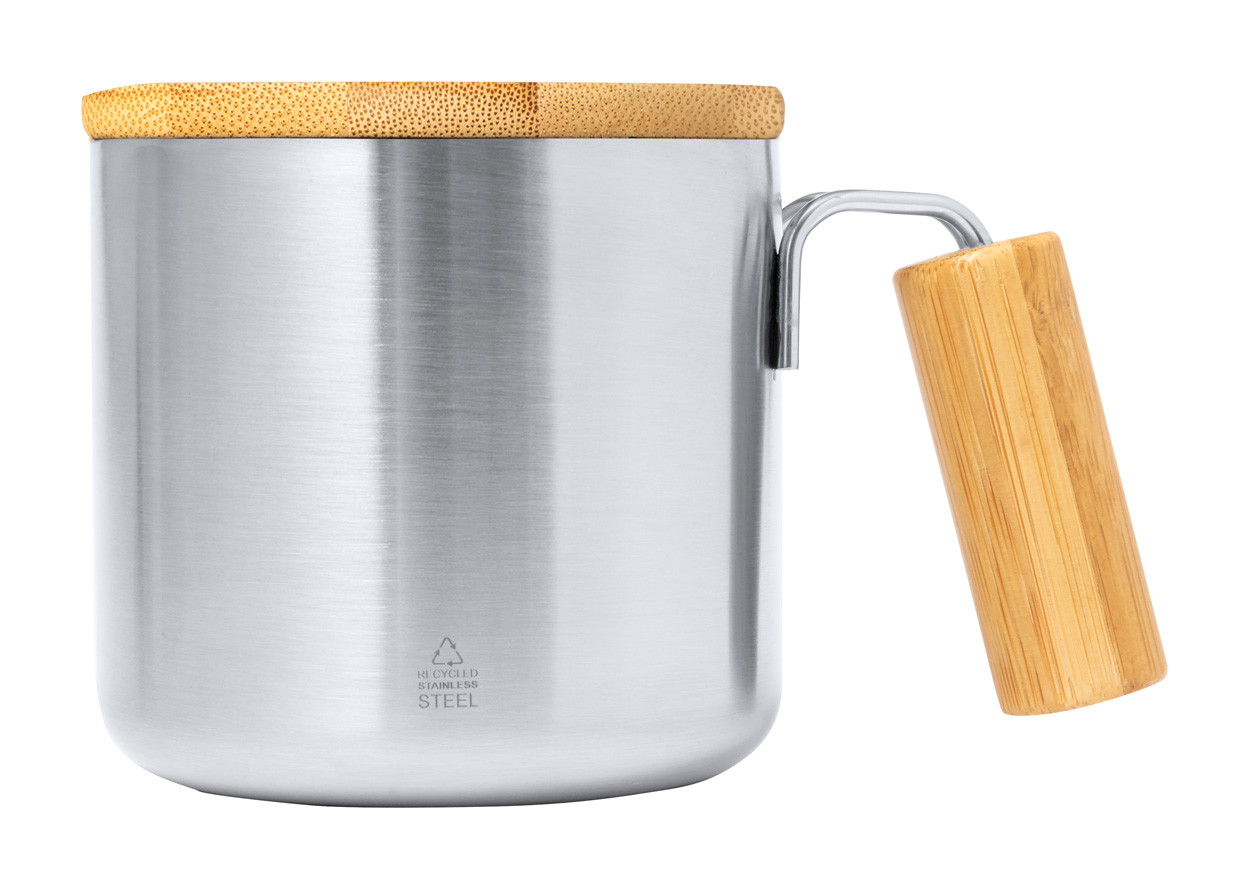 Dvojstenný termohrnček z recyklovanej nerezovej ocele s bambusovým uchom a viečkom. 330 ml.
