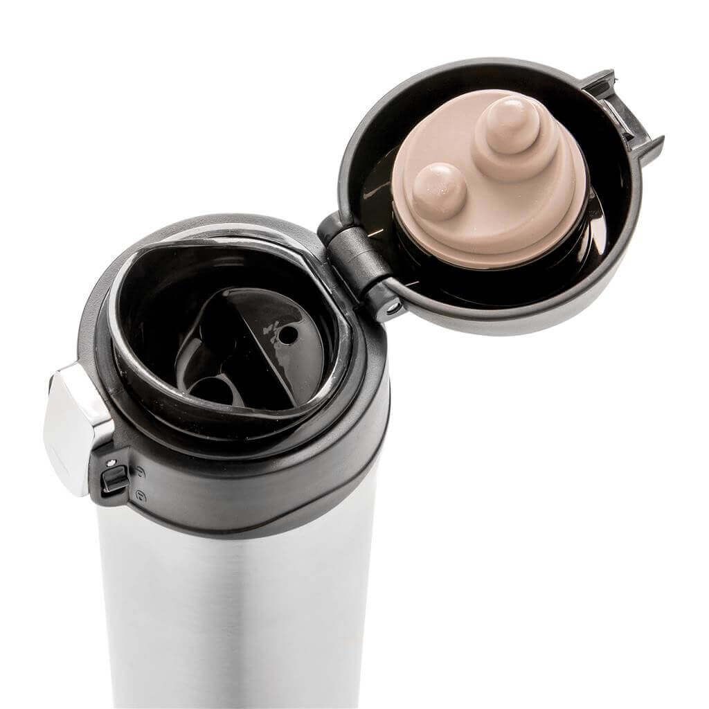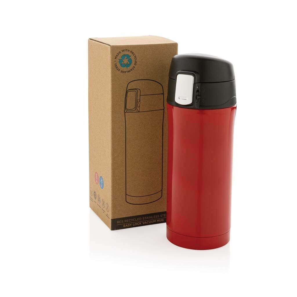 Termohrnček Easy lock s jedinečným dizajnom. Uzáver je možné jednoducho ovládať jednou rukou a uzamknúť pre zabránenie vyliatiu tekutiny. Uzáver je zároveň navrhnutý pre ľahké ručné umývanie aj umývanie v umývačke riadu. Nápoje uchová až 5h teplé a 15h studené. Priemer zodpovedá väčšine držiakom v automobiloch. Vyrobená z RCS recyklovanej ocele. RCS (Recycled Claim Standard) je globálny štandard, ktorý umožňuje overiť použitie recyklovaného materiálu v produkte naprieč celým dodávateľským reťazcom. Celkový podiel recyklátu podľa váhy produktu: 71 %. Objem: 300 ml. Balené v FSC® kraftovej darčekovej krabičke.