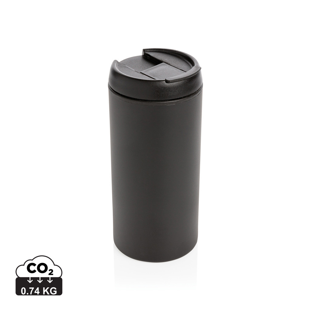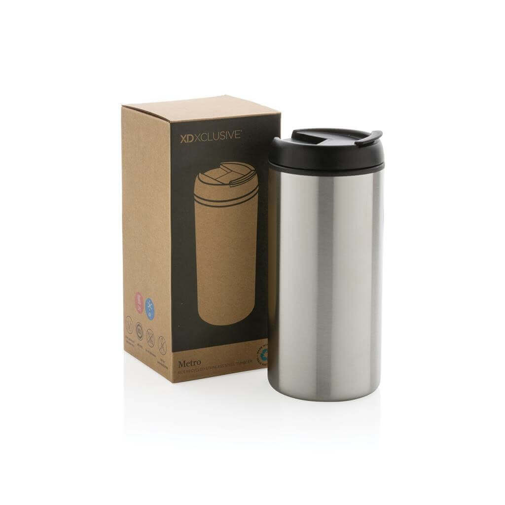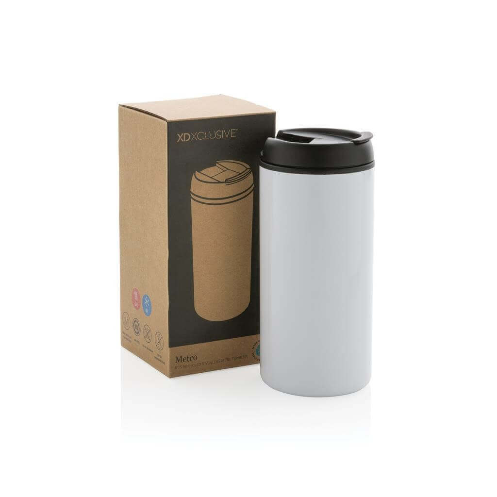 Minimalistický termohrnček Metro s odklápacím viečkom a nestarnúcim dizajnom. Vyrobené z RCS reyklovaných materiálov. RCS (Recycled Claim Standard) je globálny štandard, ktorý umožňuje overiť použitie recyklovaného materiálu v produkte naprieč celým dodávateľským reťazcom. Celkový podiel recyklátu podľa váhy produktu: 90%. Objem: 300 ml. Balené v FSC® kraftovej darčekovej krabičke. Bez BPA. Ochranný vzor®